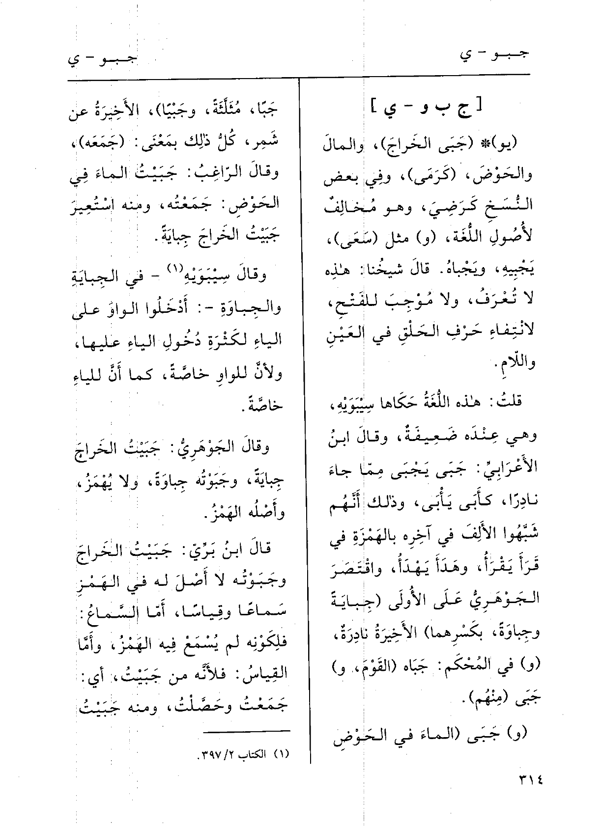 : (يو ( {جَبَى الخَراجَ) والمالَ والحَوْضَ، (كرَمَى) ؛) وَفِي بعضِ النسخِ كرَضِيَ وَهُوَ مخالِفٌ لأُصولِ اللّغَةِ؛ (و) مِثْل (سَعَى) ،} يَجْبِيه {ويَجْباهُ.