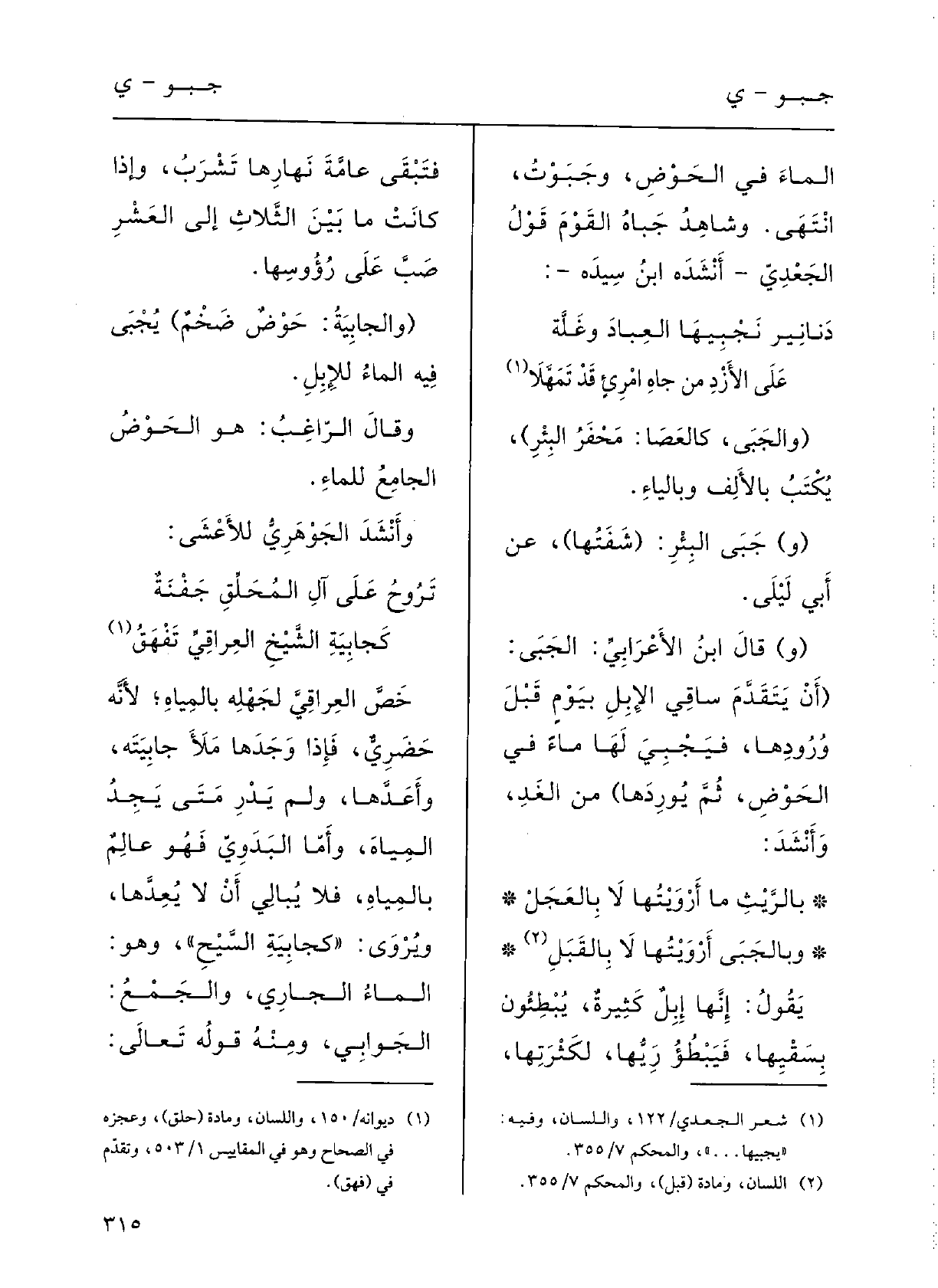 } وبالجَبَى أَرْوَيْتها لَا بالقَبَل ْيقولُ: إنَّها إبِلٌ كثيرَةٌ يُبْطِئونَ بسَقْيها فيُبْطِىءُ رَيُّها لكَثْرتِها فتَبْقَى عامَّة نهارِها تَشْرَب، وَإِذا كانتْ مَا بينَ الثَّلاث إِلَى العَشْر صبّ على رُؤُوسِها.