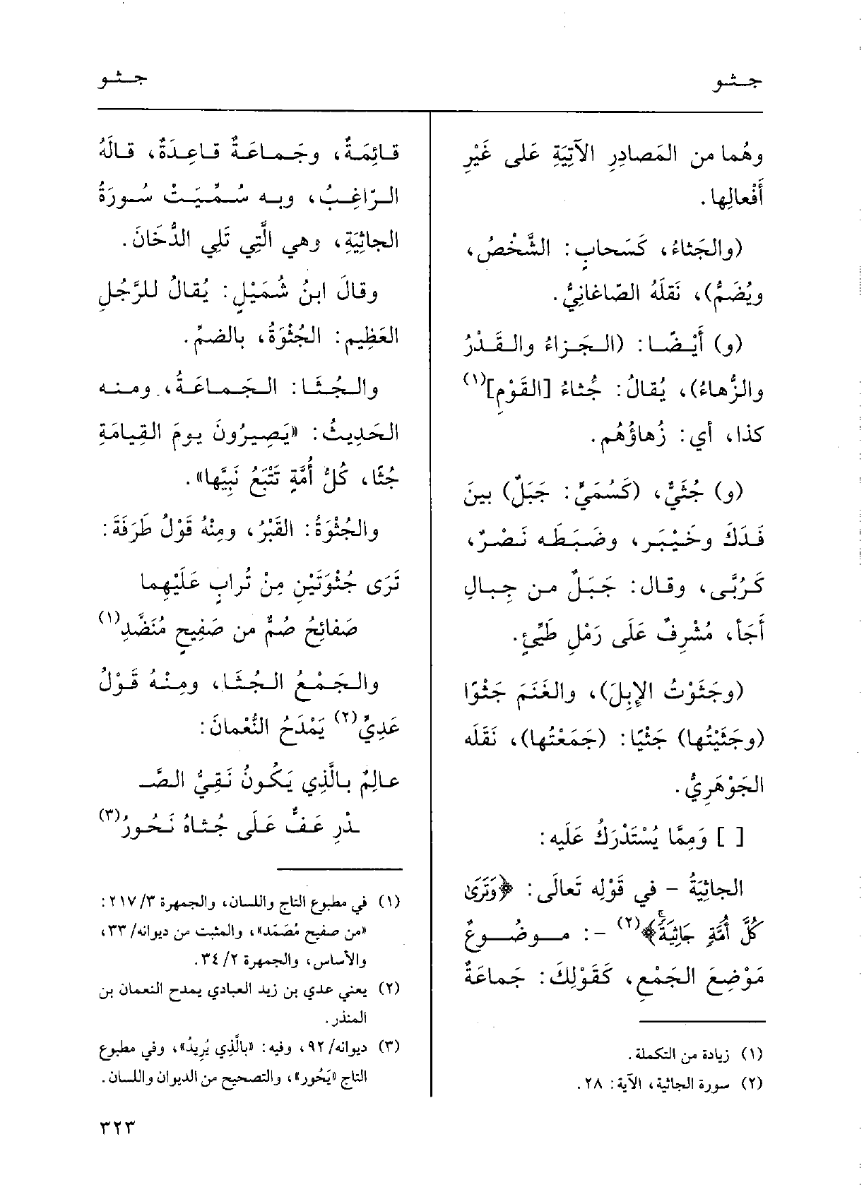 } الجاثِيَةُ فِي قوْلِه تَعَالَى: {وَترى كُلَّ أُمَّةٍ {جاثِيَةً} ، مَوْضوعٌ مَوْضِع الجَمْع كقوْلِكَ جماعَةٌ قائِمَةٌ وجماعَةٌ قاعِدَةٌ: قالَهُ الرَّاغبُ؛ وَبِه سُمِّيَت سُورَةُ الجاثِيَة وَهِي الَّتِي تلِي الدّخانَ.