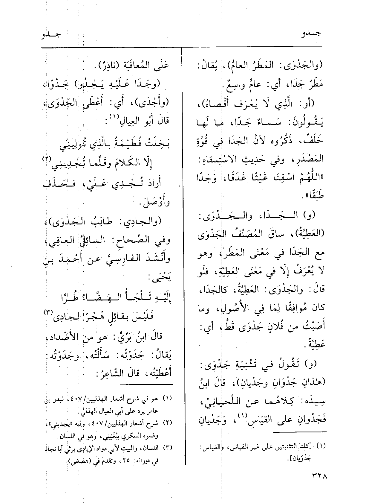 إِلَيْهِ تَلْجَأُ الهَضَّاءُ طُرّاً فلَيْسَ بقائِلٍ هُجْراً {- لجَادِي قالَ ابنُ بَرِّي: هُوَ مِن الأَضْدادِ: يقالُ:} جَدَوْتُه سَأَلْته،! وجَدَوْتُه أَعْطَيْته؛ قالَ الشَّاعِرُ: