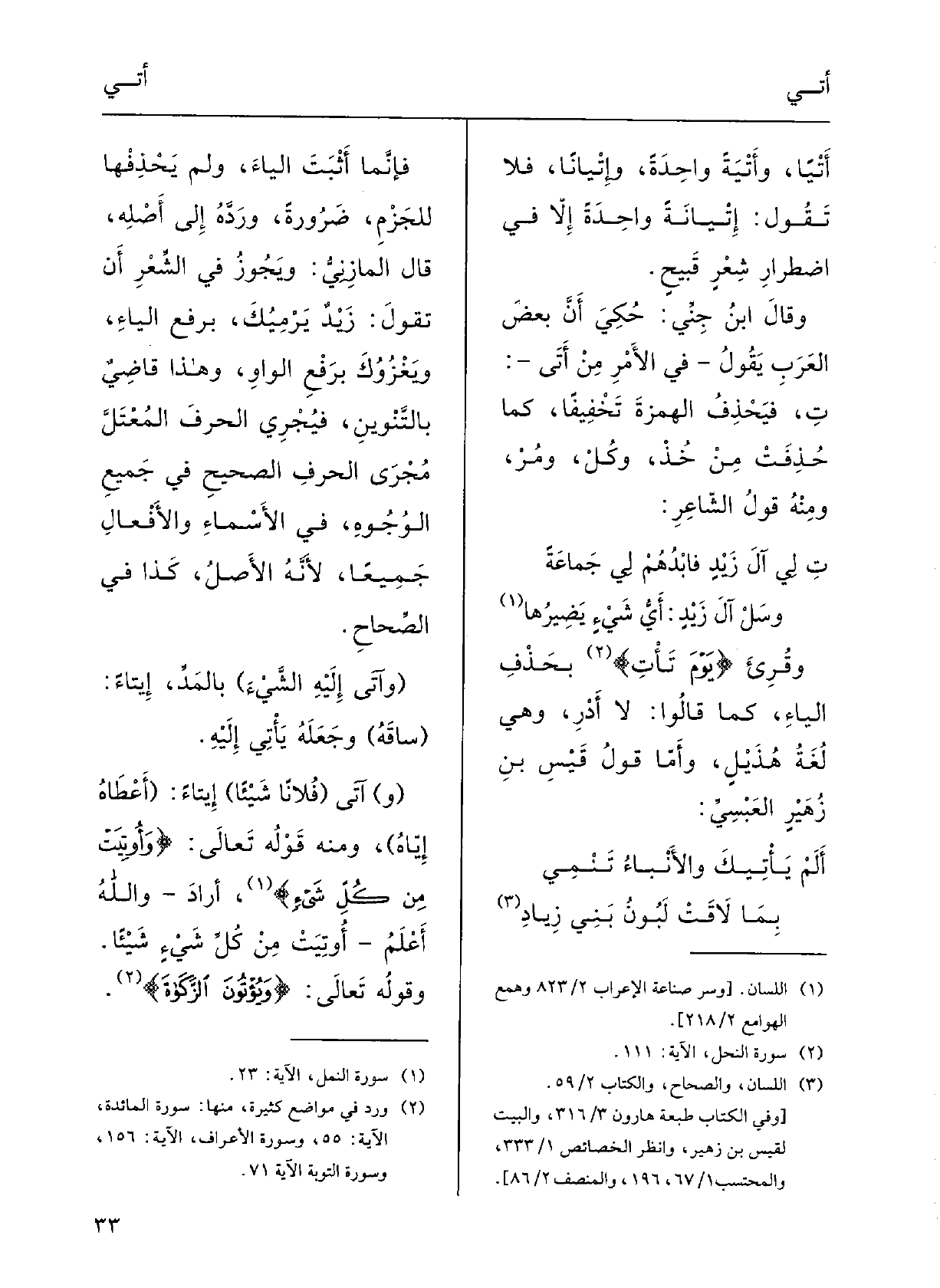 تِ لي آلَ زيْدٍ فابْدُهم لي جماعةًوسَلْ آلَ زيدٍ أَيُّ شيءٍ يَضِيرُهاوقُرِىءَ: يومَ {تَأْتِ، بحذْفِ الياءِ كَمَا قَالُوا لَا أَدْرِ، وَهِي لُغَةُ هُذيْل؛ وأَمَّا قَوْلُ قَيْسِ بنِ زُهَيْر العَبْسيّ: