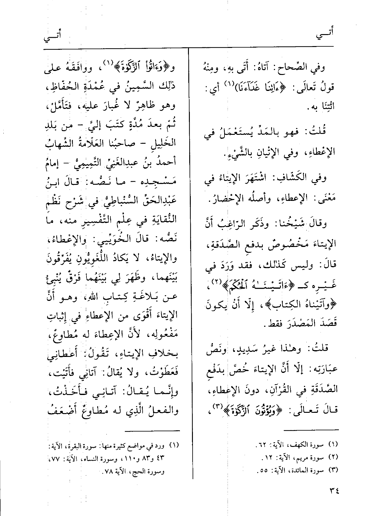 قُلْتُ: وَهَذَا غَيْرُ سَديدٍ، ونَصُّ عِبارَتِهِ: إلاَّ أَنَّ الإيتاءَ خُصَّ بدَفْعِ الصَّدَقَةِ فِي القُرْآنِ دُونَ الإعْطاء قالَ تعالَى: {ويُؤْتُونَ الزَّكاةَ} . {} وآتُوا الزَّكاةً} ؛ ووَافَقَه على ذلِكَ السَّمين فِي عمدَةِ الحفَّاظِ، وَهُوَ ظاهِرٌ لَا غُبَارَ عَلَيْهِ، فتأَمَّل.