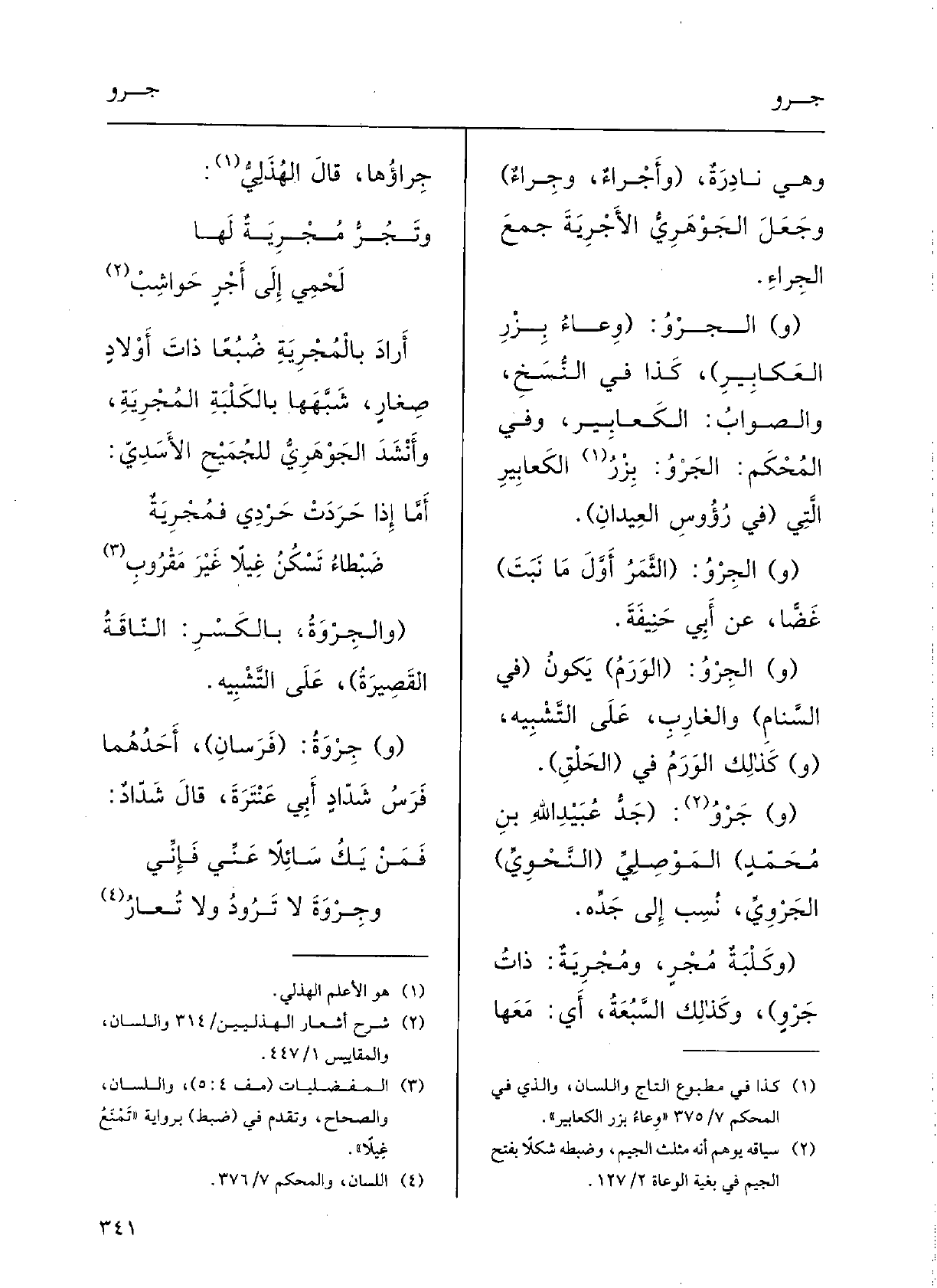 لَحْمِي إِلَى أَجْرٍ حَواشِبْأَرَادَ {بالمُجْرِيَة ضَبُعاً ذَات أَوْلادٍ صغارٍ، شبَّهَها بالكلْبَةِ} المُجْرِيَة؛ وأَنْشَدَ الجوْهرِيُّ للجُمَيْحٍ الأسَدِيِّ: