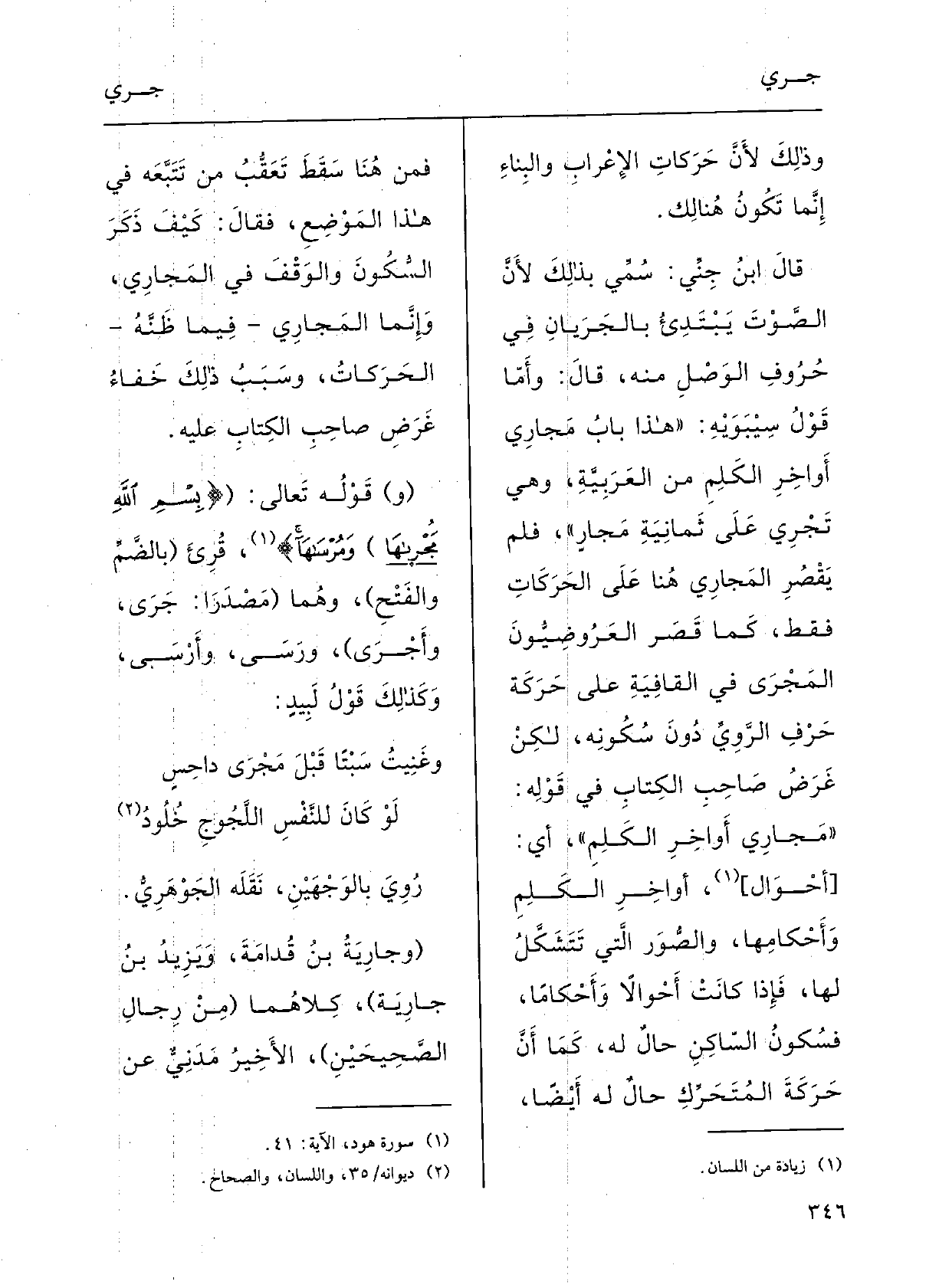 قالَ ابنُ جنِّي: سُمِّي بذلكَ لأنَّ الصَّوْتَ يَبْتدِىءُ {بالجَرَيانِ فِي حُرُوفِ الوَصْلِ مِنْهُ؛ قالَ: وأَمَّا قَوْل سِيْبَوَيْه هَذَا بابُ} مَجارِي أَواخِرِ الكَلِمِ مِن العَربيَّةِ، وَهِي تَجْرِي على ثمانِيَةِ مَجارٍ، فَلم يَقْصُر {المَجارِيَ هُنَا على الحَرَكاتِ فَقَط كَمَا قَصَر العَرُوضيُّون} المَجْرَى فِي القافِيَةِ على حركةِ حَرَفِ الرَّوِيِّ دون سكونِيه) ، أَي يُسَائِلُونَه عَلَيه.