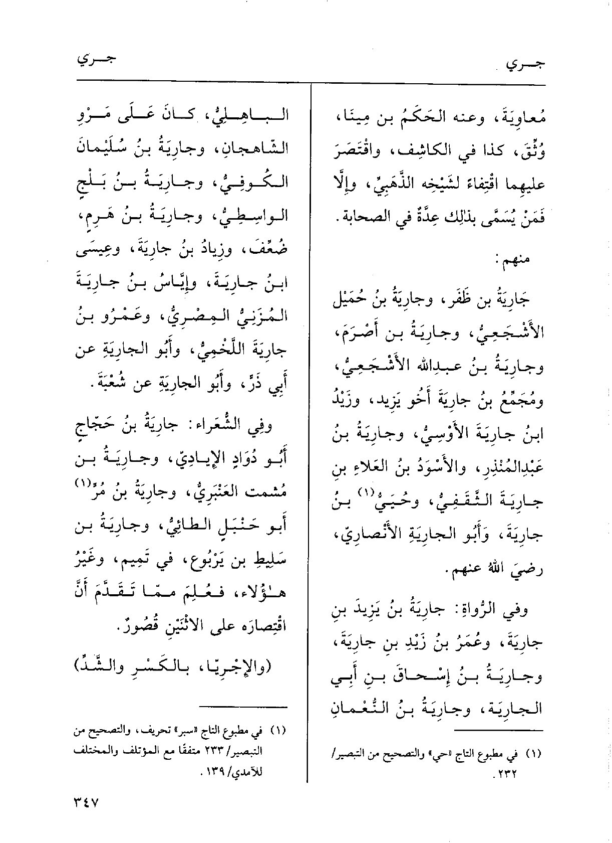 وَفِي الشُّعَراء: جارِيَةُ بنُ حَجَّاج أَبو دُوَاد الإيادِيُّ، وجارِيَةُ بنُ مشمت العَنْبريُّ، وجارِيَةُ بنُ سبر أَبو حَنْبلٍ الطائيُّ، وجارِيَةُ بن سليط بنِ يَربوعٍ فِي تمِيمٍ، وغيرُ هؤلاءِ. فعُلِمَ ممَّا تقدَّمَ أَنَّ اقْتِصارَه على الاثْنَيْن قُصورٌ.