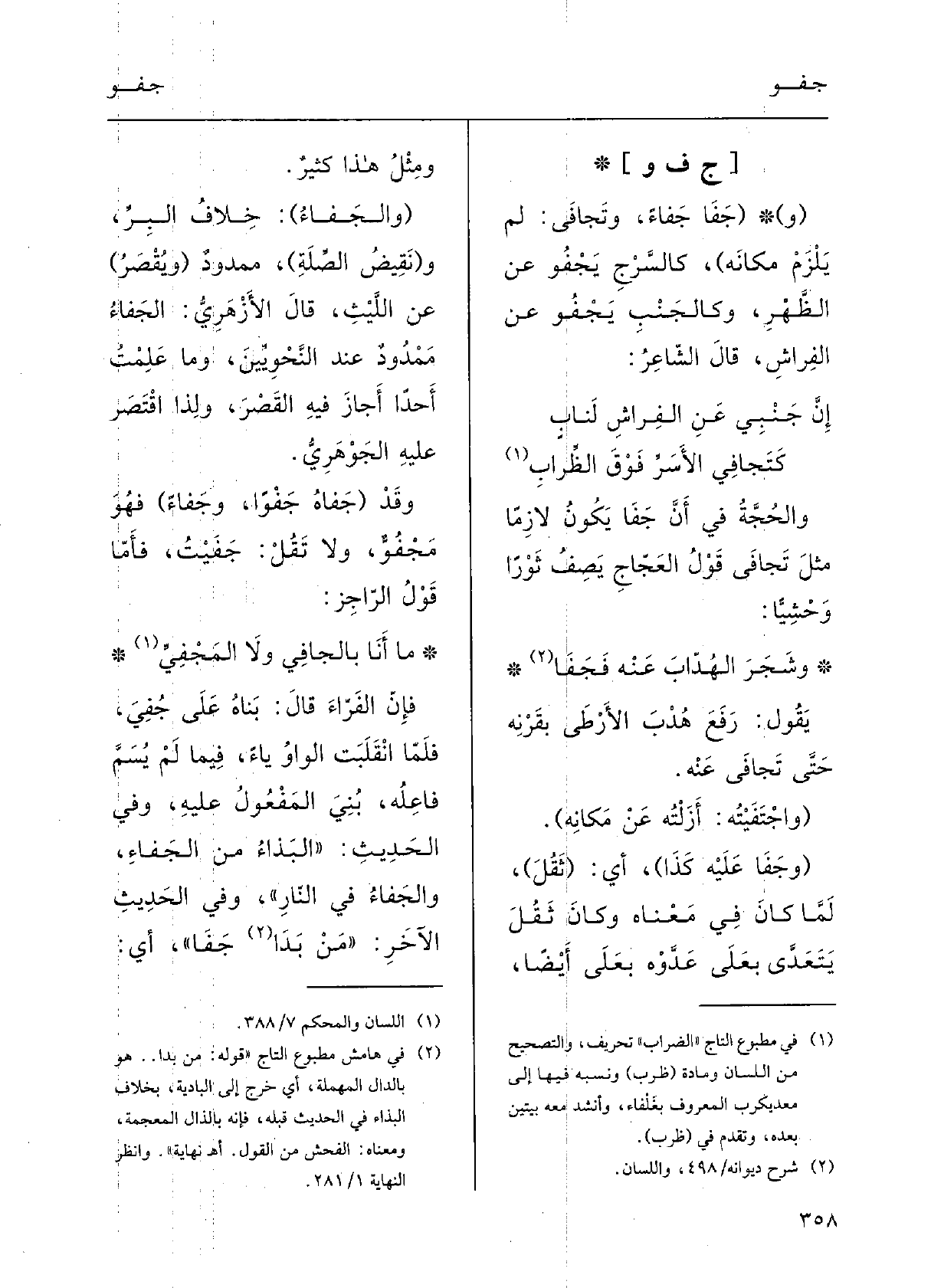 } كتَجافِي الأَسَرِّ فَوْقَ الظِّرابِوالحُجَّةُ فِي أَنَّ جَفا يكونُ لازِماً مِثْل {تَجافَى قولُ العجَّاج يَصِفُ ثوْراً وحْشِيّاً: