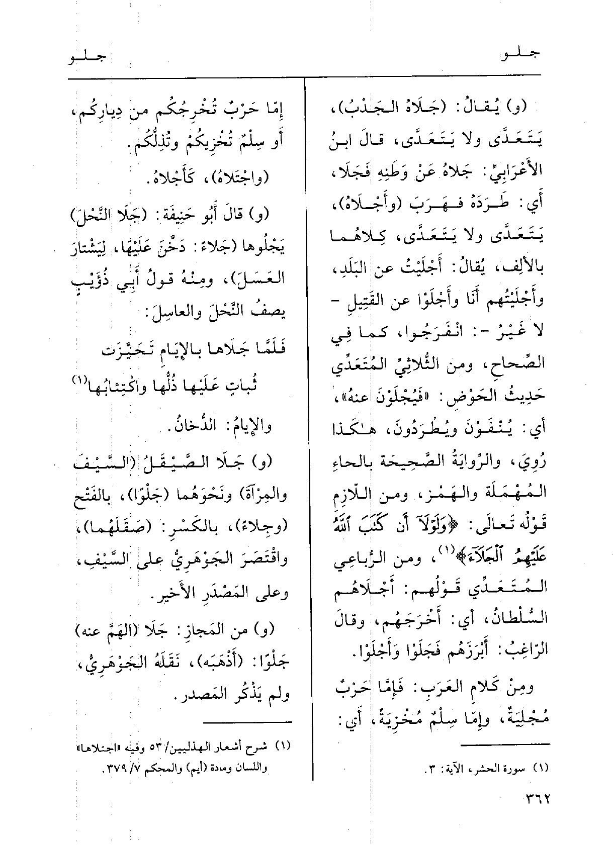 وَمن الَّلازِمِ قوْلُه تَعَالَى: {وَلَوْلَا أَن كَتَبَ اللَّهُ عَلَيْهِم} الجلاءَ} ، ومِن الرباعي المُتَعدِّي: قَوْلُهم: {أَجْلاهُم السُّلْطانُ، أَي أَخْرَجَهم.