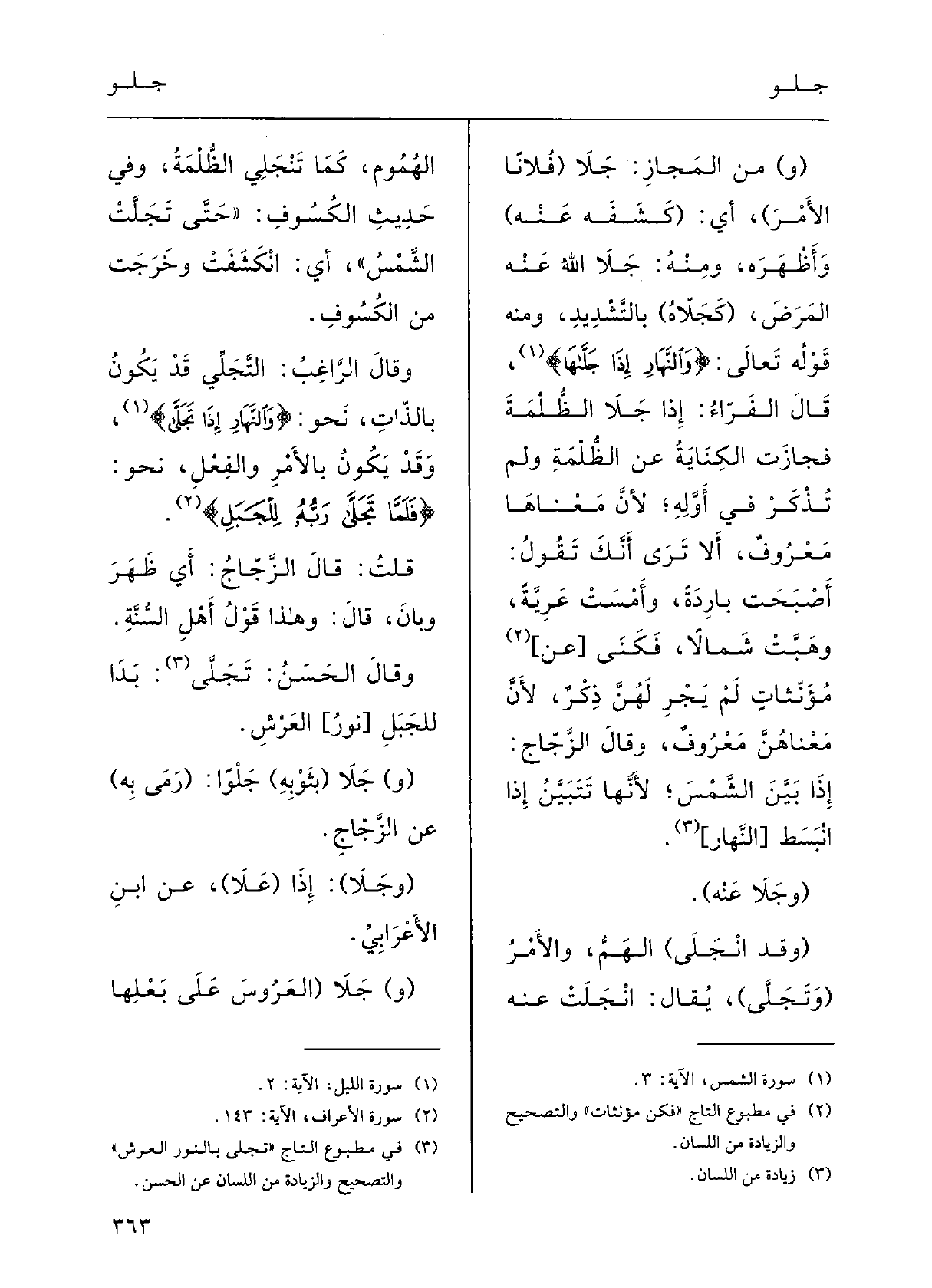 وَفِي حديثِ الكُسوف: حَتَّى} تَجَلَّتِ الشَّمسُ، أَي انْكَشَفَتْ وخَرَجَتْ من الكسوفِ.