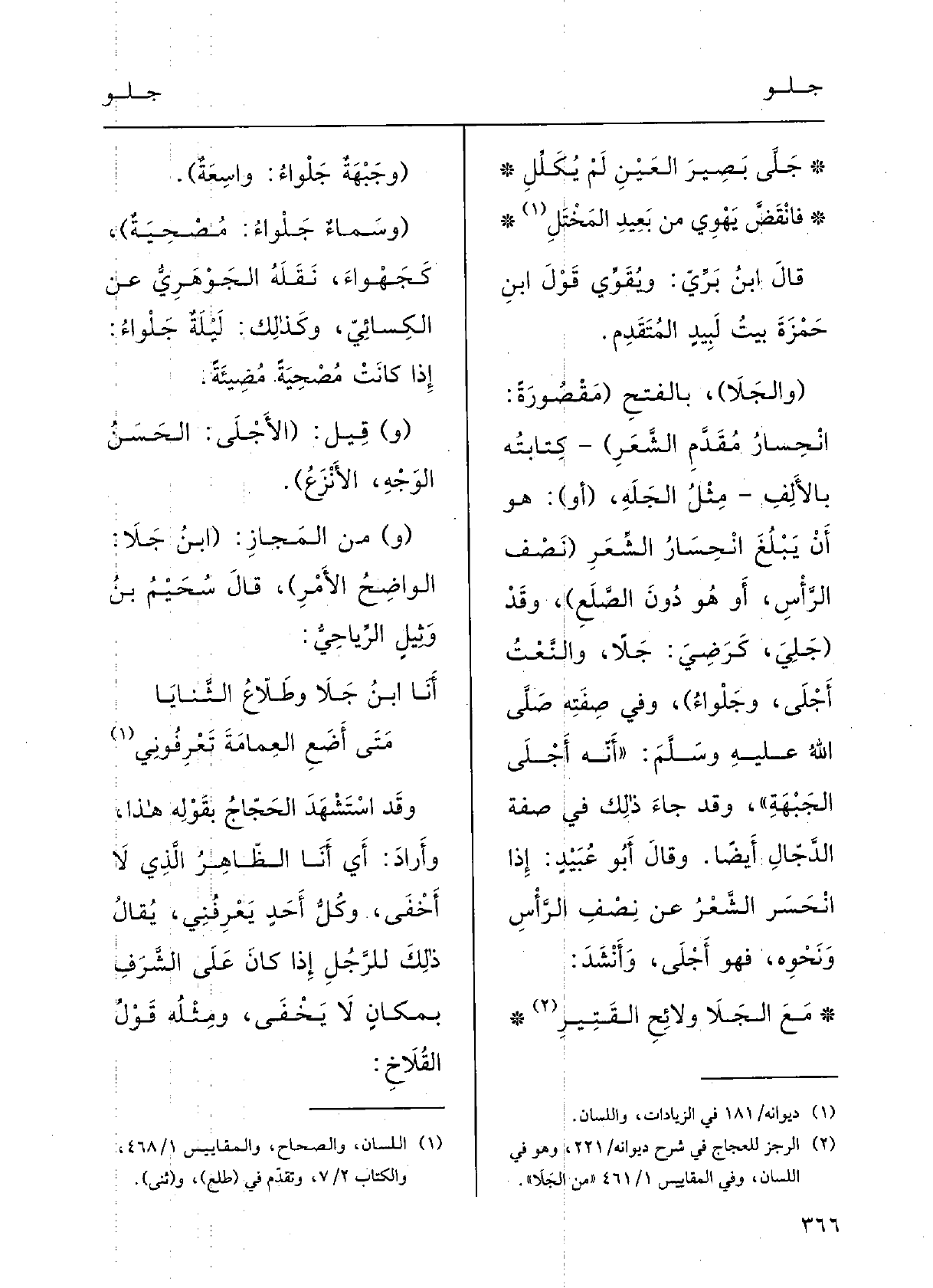 ( {والجَلا) ، بالفتْحِ (مَقْصُورَةً: انْحِسارُ مُقَدَّمِ الشَّعَرِ) ؛) كتابَتُه بالأَلفِ مِثْل الجَلَه؛ (أَو) هُوَ أنْ يَبْلغَ انْحِسارُ الشَّعَرِ (نِصْفَ الرَّأْسِ، أَو هُوَ دُونَ الصَّلَعِ) ؛) وَقد (} جَلِيَ، كرَضِيَ، {جَلاً، والنَّعْتُ} أَجْلَى {وجَلْواءُ) .) وَفِي صفَتِه صلى الله عَلَيْهِ وَسلم (أَنَّه أَجْلَى الجَبْهةِ؛ وَقد جاءَ ذلِكَ فِي صفَةِ الدجَّالِ أَيْضاً.