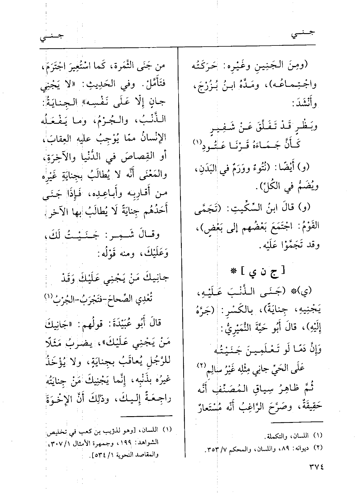: (ي (} جَنَى الذَّنْبَ عَلَيْهِ {يَجْنِيهِ} جِنايَةً) ، بالكسْرِ: (جَرَّهُ إِلَيْهِ) ؛) قالَ أَبو حيَّةَ النُّميري: