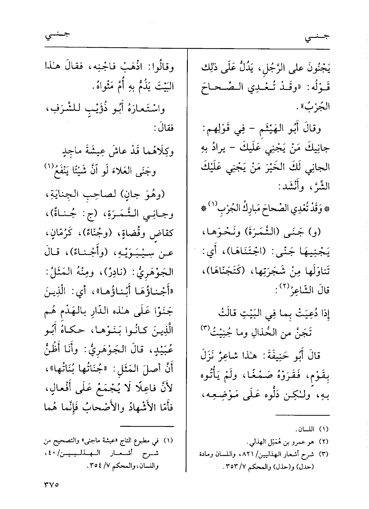 } تَجَنَّ من الجِذَالِ وَمَا {جُنيتُ قالَ أَبو حنيفَةَ: هَذَا شاعِرٌ نَزَلَ بقوْمٍ فقَرَوْهُ صَمْغاً وَلم يَأْتوه بِهِ، ولكنْ دَلُّوه على موْضِعِه وَقَالُوا: اذْهَبْ} فاجْنِه، فقالَ هَذَا البَيْتَ يَذُمُّ بِهِ أُمَّ مَثْواهُ، واسْتعارَهُ أَبو ذُؤَيْبٍ للشَّرَف؛ فقالَ: