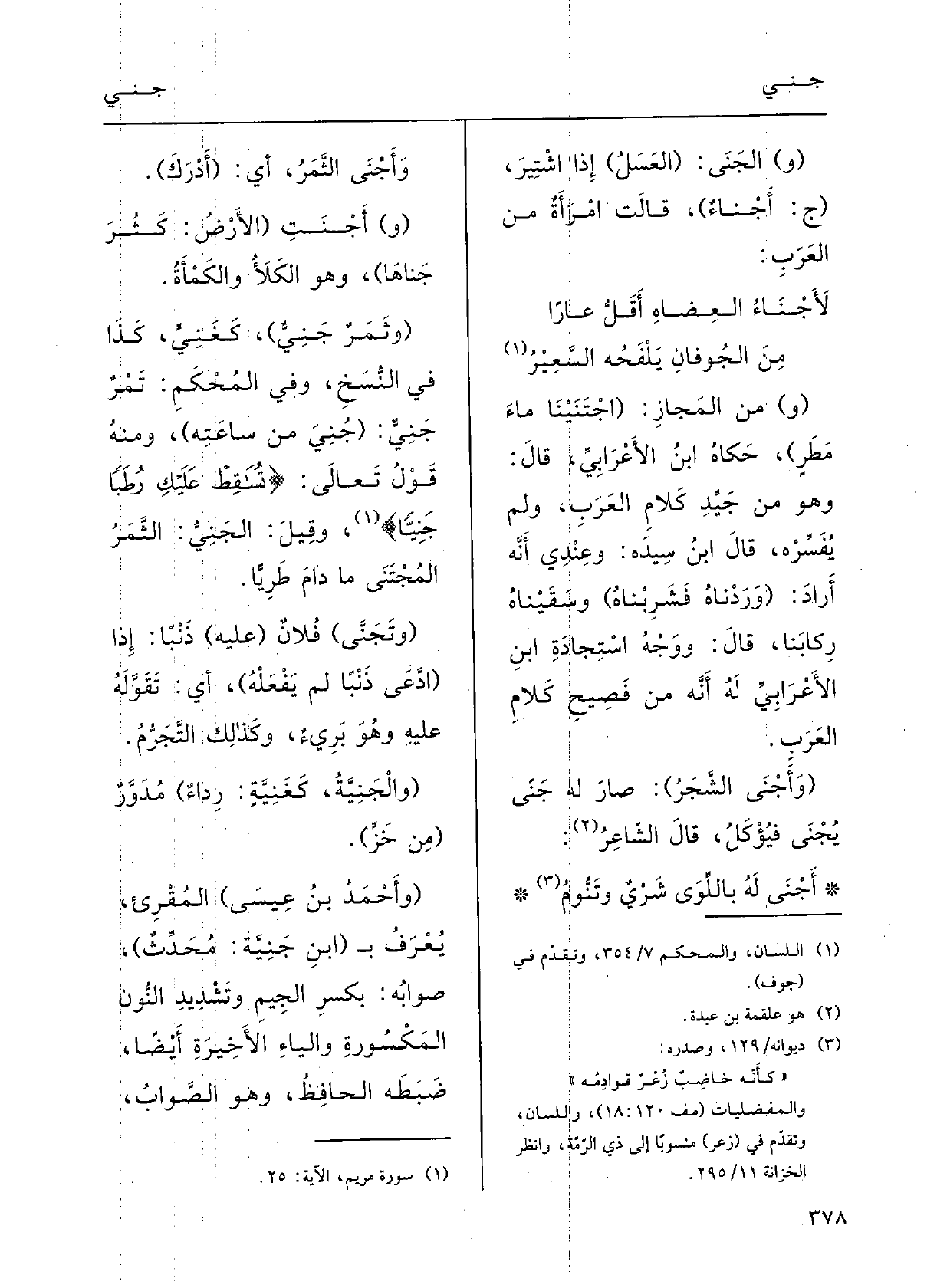 (وثَمَرٌ {جَنِيٌّ) ، كغَنِيَ؛ كَذَا فِي النسخِ، وَفِي المُحْكَم: تَمْرٌ جَنِيٌّ؛ (} جُنِيَ من ساعَتِه) ؛) وَمِنْه قوْلُه تَعَالَى {تُساقِطُ عليكِ رُطَباً {جَنِيّاً} .