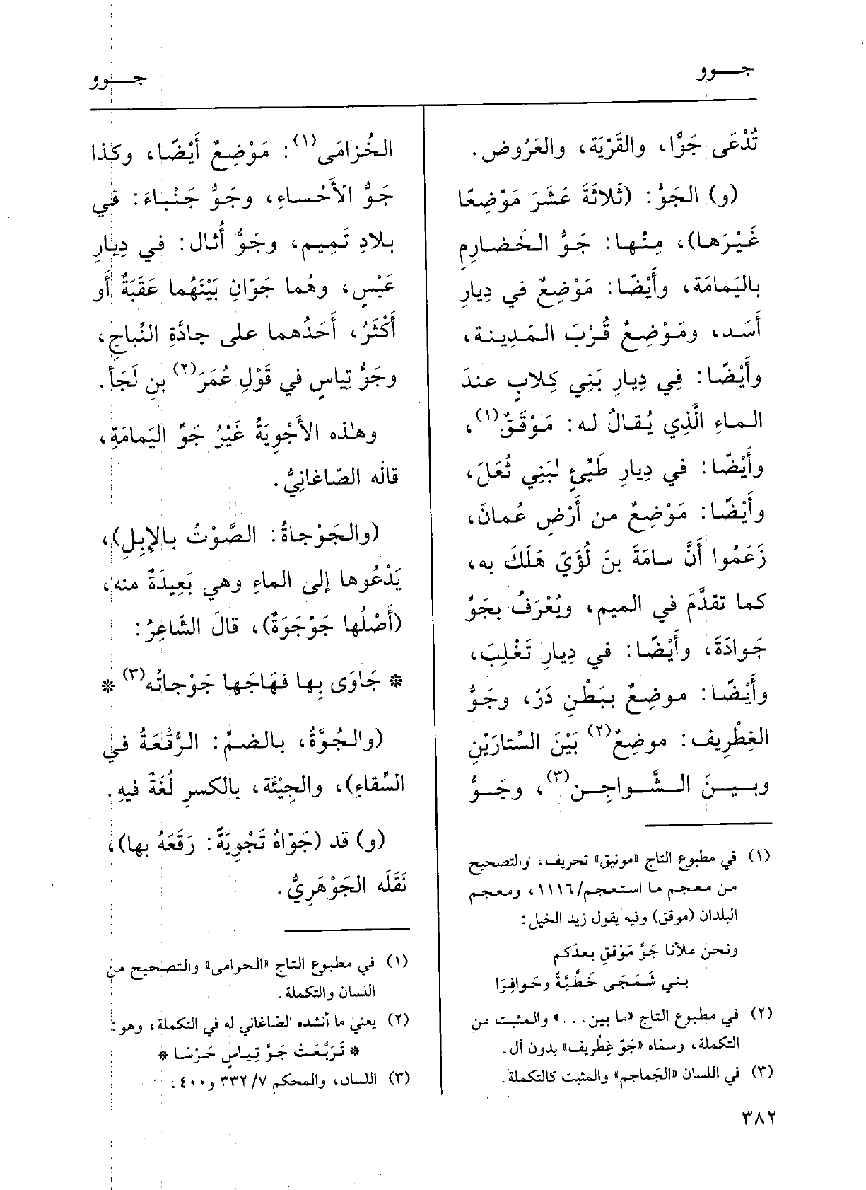 (و) الجَوُّ: (ثَلاثةَ عَشَرَ مَوْضِعاً غيرَها) ، مِنْهَا: جَوُّ الخضارمِ باليَمامَةِ، وأَيْضاً مَوْضِعٌ فِي دِيارِ أَسَد، ومَوْضِعٌ قرْبَ المَدينَةِ، وأَيْضاً فِي دِيارِ بَني كِلابٍ عنْدَ الماءِ الَّذِي يقالُ لَهُ مونيق، وأَيْضاً فِي دِيارِ طيِّىء لبَني ثُعَل، وأَيْضاً مَوْضِعٌ مِن أرْضِ عُمَان زَعَمُوا أَنَّ سامَةَ بن لُؤَيَ هَلَكَ بِهِ كَمَا تقدَّم فِي الميمِ ويُعْرَفُ} بجَوِّ جوادَةَ؛ وأَيْضاً فِي دِيار تَغْلب؛ وأيْضاً مَوْضِعٌ ببَطْنِ درّ؛ وجَوُّ الغِطْرِيفِ مَا بينَ السِّتَارَيْن وَبَين الشَّواجِنِ؛ {وجَوُّ الخزامى مَوْضِعٌ أَيْضاً؛ وَكَذَا جَوُّ الأَحْساءِ، وجَوُّ جنبا فِي بلادِ تمِيمٍ؛ وجَوُّ أَثَال فِي دِيارِ عَبْس وهُما} جَوَّان بَيْنهما عقبَةٌ أَو أَكْثَر أَحَدُهما على جادةِ النباجِ؛ وجَوُّ تِيَاس فِي قوْلِ عُمَر بن لَجَأ.
