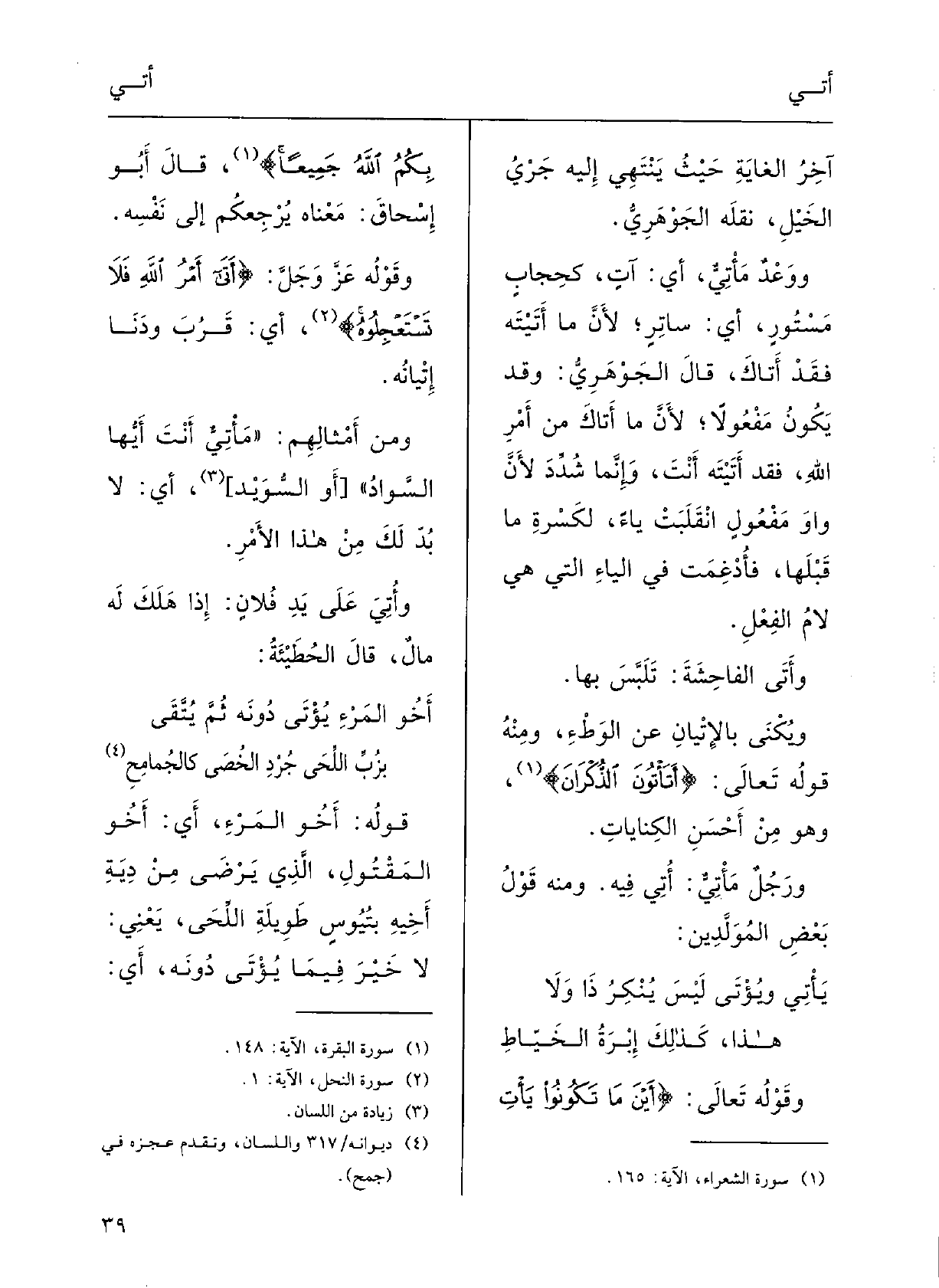 يَأْتي} ويُؤْتَى ليسَ ينكرُ ذَا ولاهذا كَذلِكَ إبْرة الخيَّاطوقَوْلُه تَعَالَى: {أَيْنَما تكُونُوا {يأْتِ بكُم اللَّهُ جَمِيعاً} . قالَ أَبو إسْحاق: مَعْناهُ يُرْجِعُكُم إِلَى نَفْسِه.