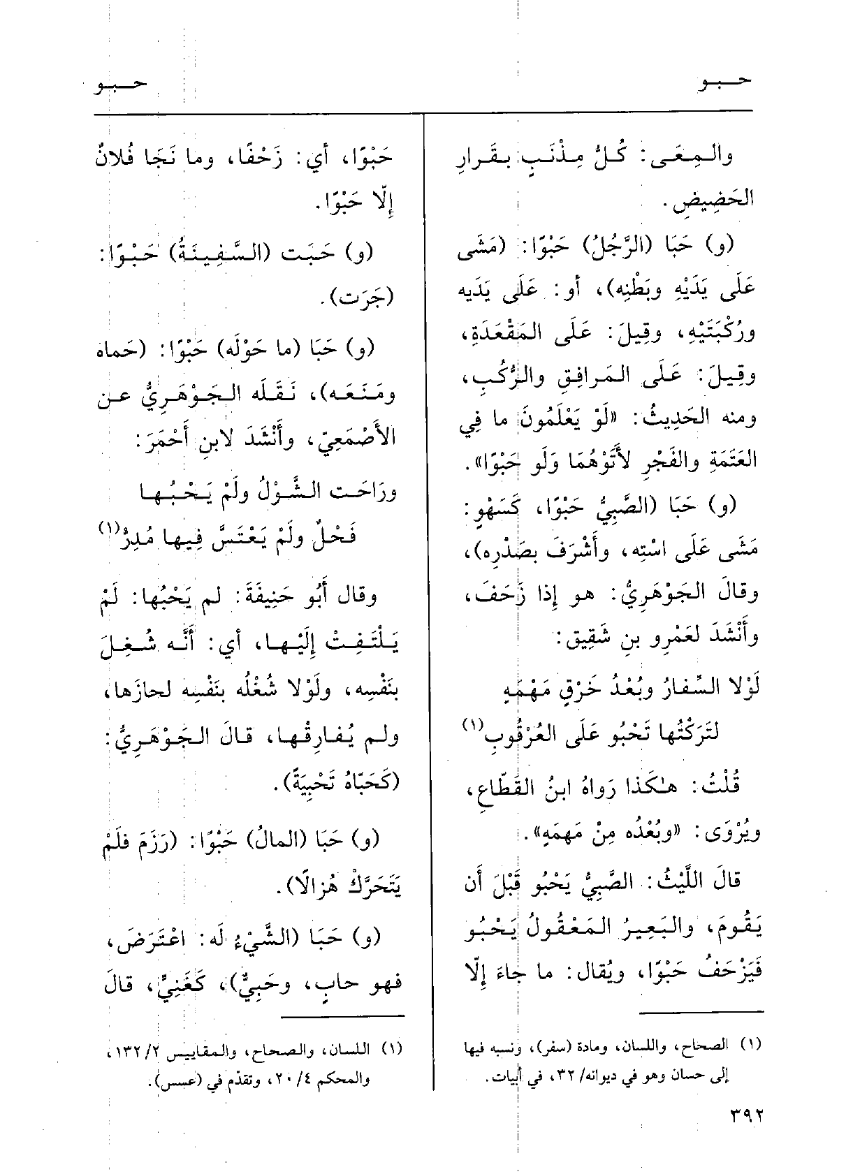 (و) حَبَا (الرَّجُلُ) حَبْواً: (مَشَى على يَدَيْه وبَطْنِه) ، أَو على يَدَيْه ورُكْبَتَيْه، وقيلَ: على المقْعدَةِ، وقيلَ: على المَرافِقِ والرُّكَبِ؛ وَمِنْه الحدِيثُ: (لَو يَعْلَمونَ مَا فِي العَتْمةِ والفَجْرِ لأَتَوْهما وَلَو حَبْواً) .