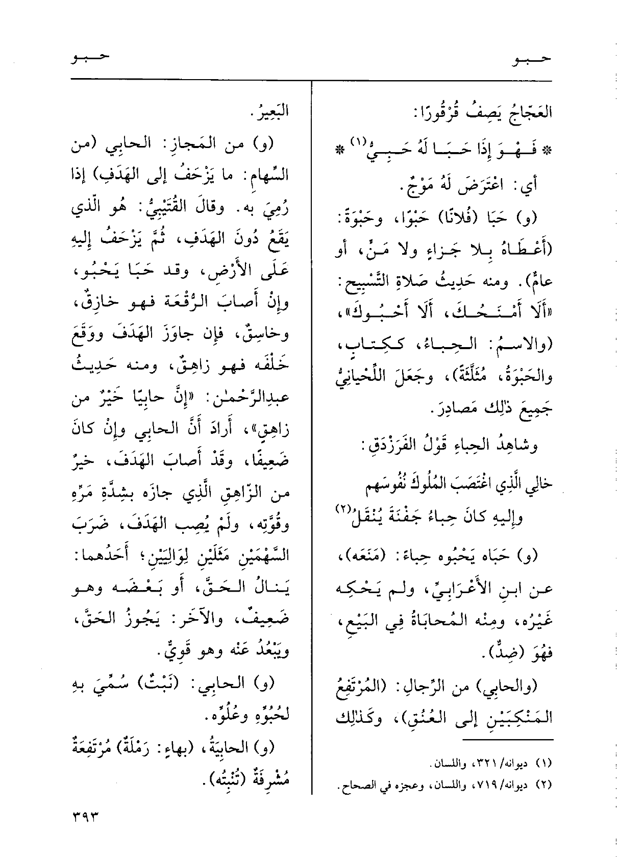 وجَعَلَ اللحْيانيُّ جَمِيعَ ذلِكَ مَصادِرِ، وشاهِدُ الحِباءِ قَوْلُ الفَرَزْدق:
