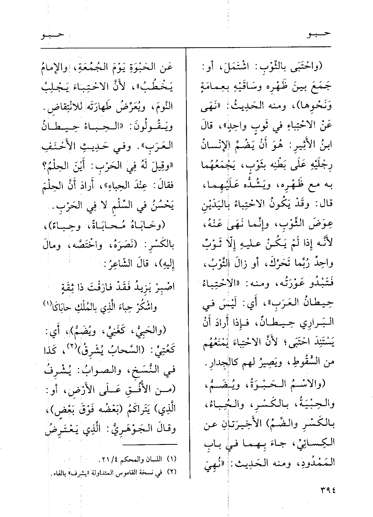 قالَ ابنُ الأثيرِ: هُوَ أَن يَضُمَّ الإِنْسانُ رِجْلَيْه على بَطْنِه بثَوْبٍ يَجْمَعُهما بِهِ مَعَ ظَهْرِه ويَشُدُّه عَلَيْهِمَا، قالَ: وَقد يكونُ الاحْتِباءُ باليَدَيْنِ عِوَضَ الثّوْبِ، وإنَّما نَهَى عَنهُ لأنَّه إِذا لم يكنْ عَلَيْهِ إلاَّ ثَوْبٌ واحِدٌ رُبَّما تَحَرَّك أَو زالَ الثَّوْبُ فتَبْدُو عَوْرَته.