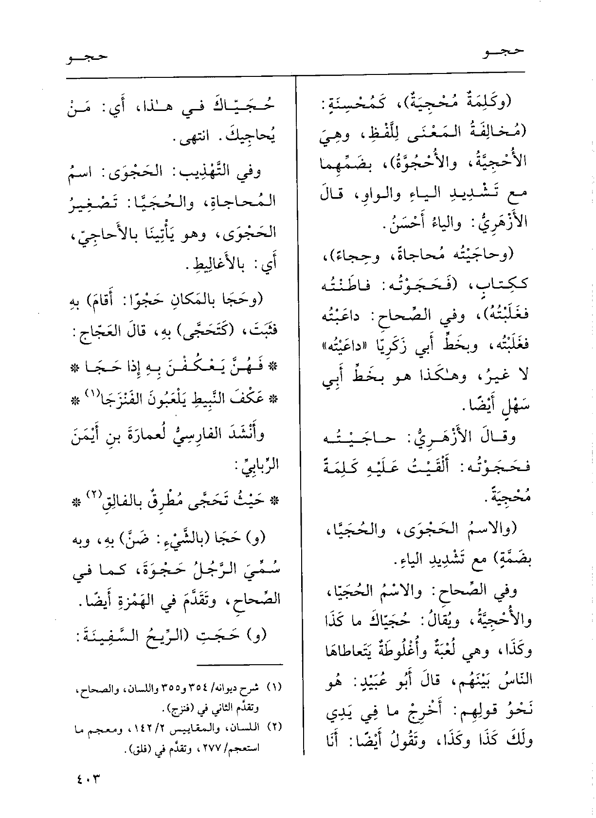 وقالَ الأزهريُّ:} حاجَيْتُه {فَحَجَوْتُه أَلْقَيْت عَلَيْهِ كَلِمَة} مُحْجِيَةً.