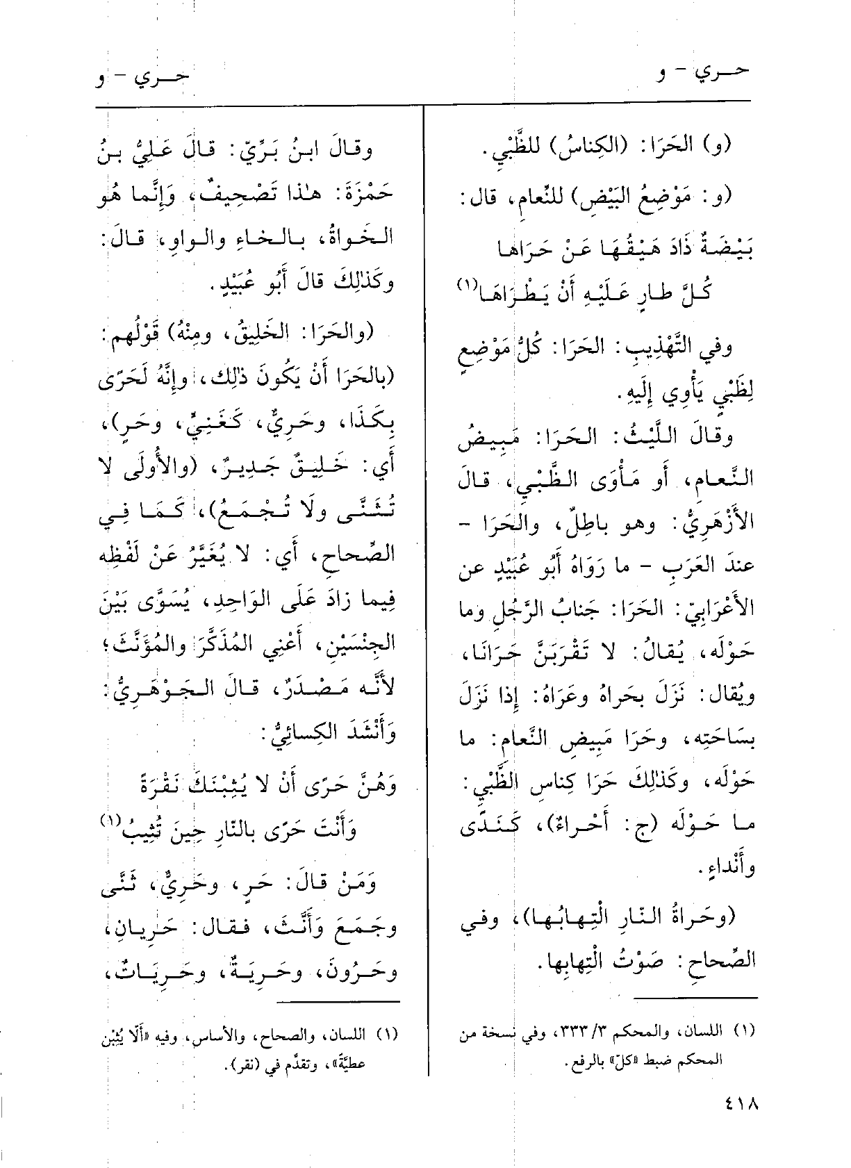 وأَنْتَ حَرىً بالنارِ حينَ تُثِيبُومَنْ قالَ {حَرٍ} وحَريٌّ ثَنَّى وجَمَعَ وأَنَّثَ فقالَ: {حَريانِ} وحَرُونَ {وحَرِيَة} وحَرِيَاتٌ