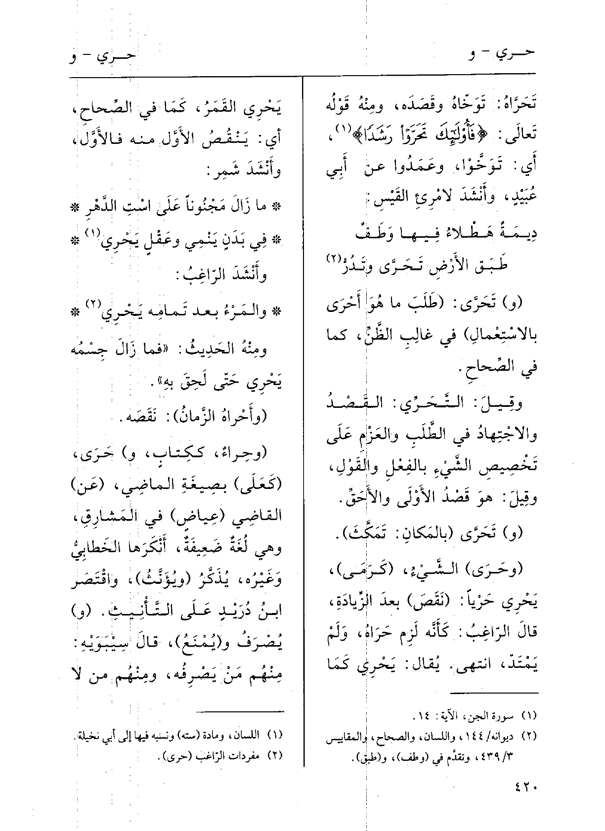 {تحرَّاهُ تَوخَّاهُ وقَصَدَه؛ وَمِنْه قَوْله تَعَالَى: {فأُولئِكَ} تَحَرُّوا رَشَداً} ، أَي توخَّوْا وعَمَدُوا؛ عَن أَبي عبيدٍ؛ وأَنْشَدَ لامْرىءِ القَيْسِ: