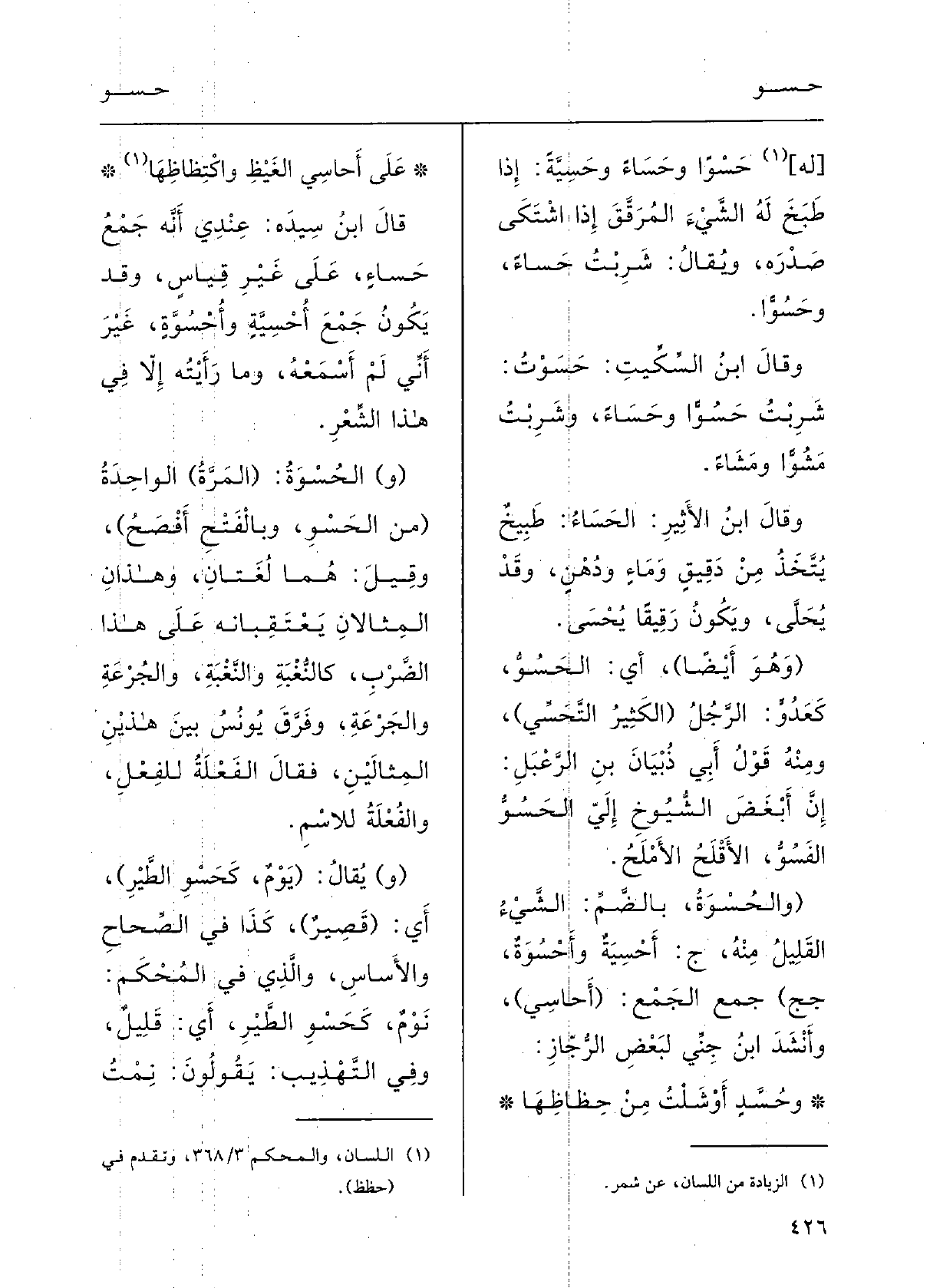 (} والحُسْوَةُ، بالضَّمِّ: الشَّيءُ القَلِيل مِنْهُ، ج {أَحْسِيَةٌ} وأَحْسُوَةٌ، جج) جَمْعُ الجَمْع (أَحاسِي) ، وأَنْشَدَ ابنُ جنِّي لبعضِ الرجَّاز:
