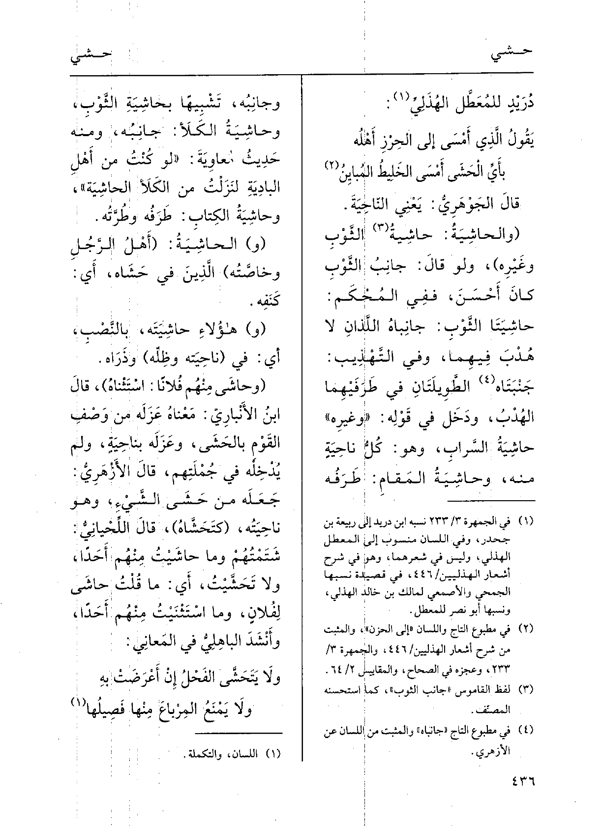 ودَخَلَ فِي قوْلِهِ: وغيرِهِ: حاشِيَة السَّرابِ، وَهُوَ كلُّ ناحِيَةٍ مِنْهُ؛} وحاِشَية المَقامِ طَرَفه وجانِبُه تَشْبيهاً {بحاشِيَةِ الثَّوْبِ؛ وحاشِيَة الكَلإِ جانِبُه.