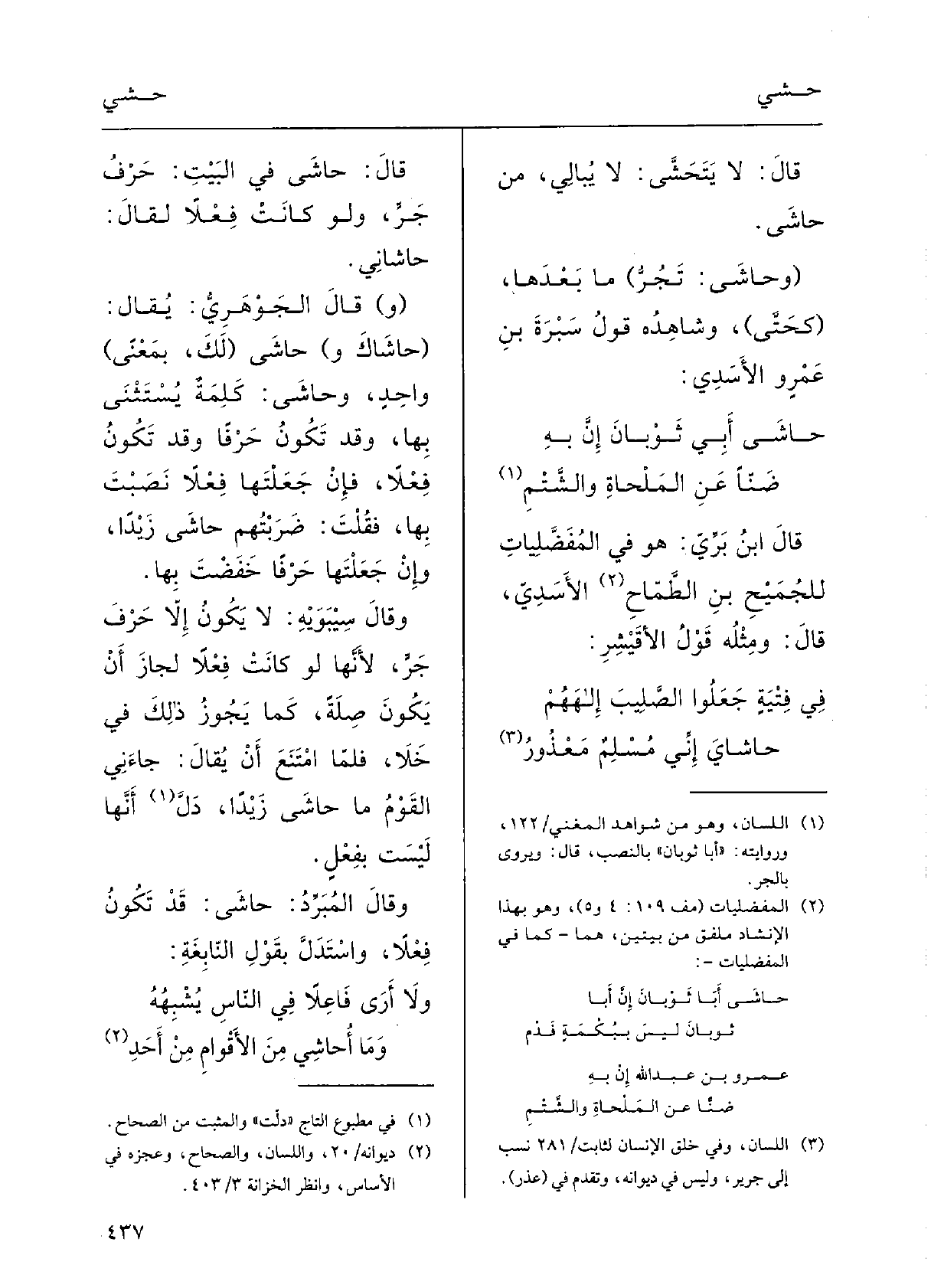 {حاشايَ إِنِّي مُسْلِمٌ مَعْذُورُقالَ: حاشَى فِي البيتِ حَرْف جَرَ، وَلَو كانتْ فعلا لقالَ} حاشاني.