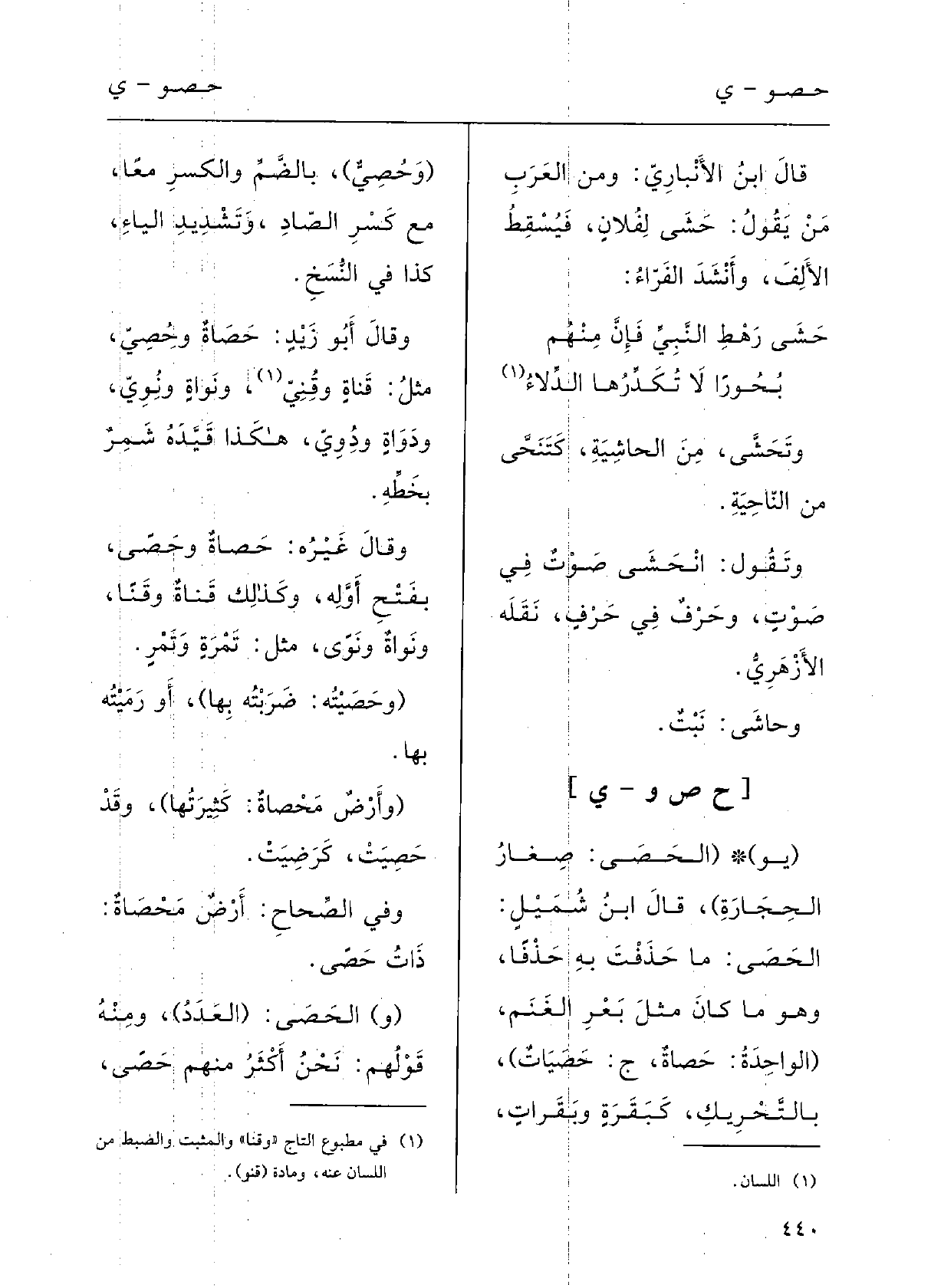 قالَ ابنُ شُمَيل: الحَصَى مَا حَذَفْتَ بِهِ حَذْفاً، وَهُوَ مَا كانَ مثْلَ بَعَرِ الغَنَم؛ (الواحِدَةُ {حَصاةٌ، ج} حَصَياتٌ) ، بالتحْرِيكِ كبَقَرةٍ وبَقَراتٍ، ( {وحُصِيٌّ) بالضمِّ والكسْرِ مَعًا مَعَ كَسْرِ الصادِ وتَشْديدِ الياءِ، كَذَا فِي النسخِ.