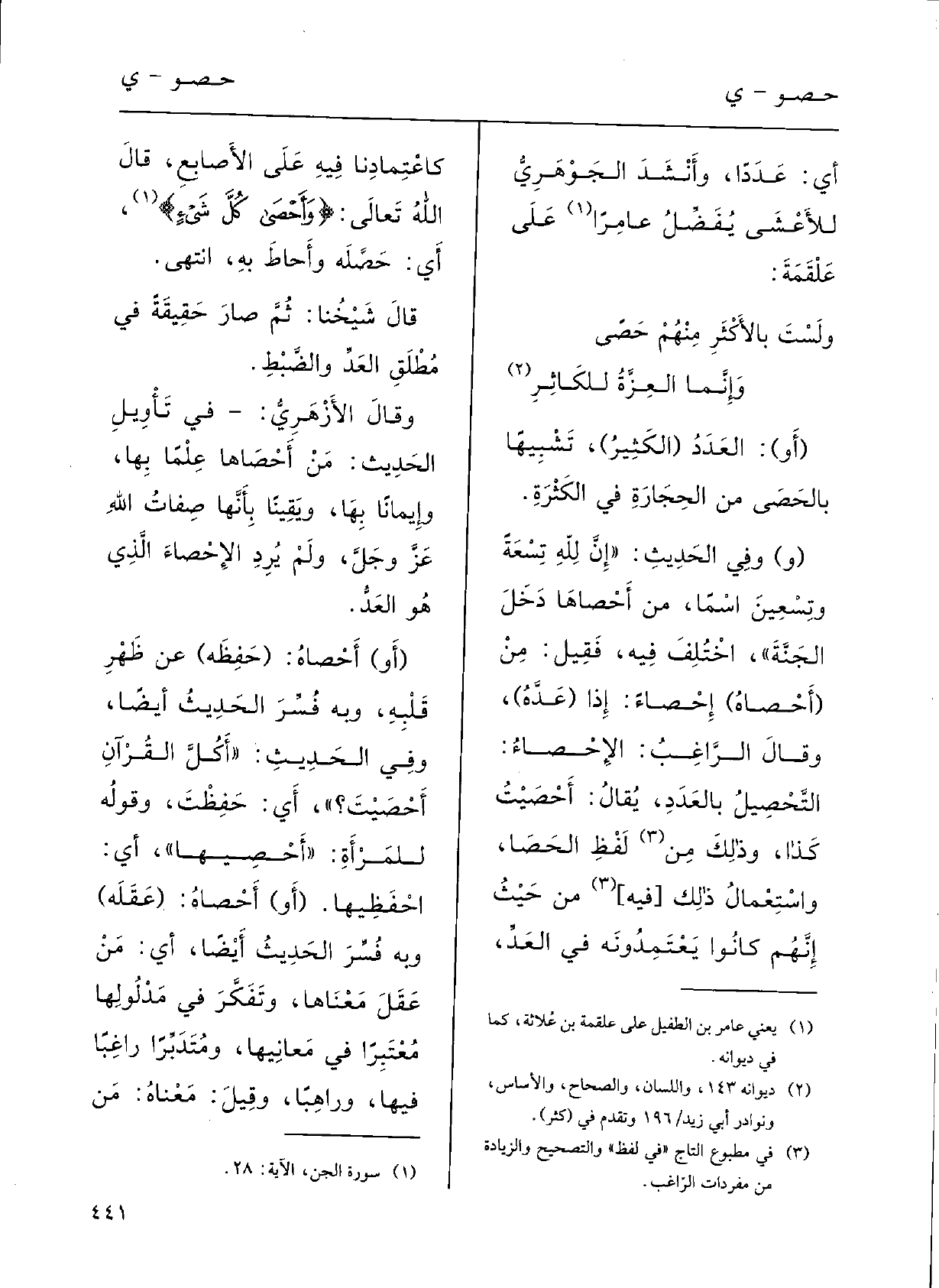 وقالَ الراغبُ:} الإِحْصاءُ التَّحْصِيلُ بالعَدَدِ يقالُ {أَحْصَيتُ كَذَا، وذلِكَ فِي لَفْظِ} الحَصَا واسْتِعْمالِ ذلِكَ مِن حيثُ أنَّهم كَانُوا يَعَتَمِدُونَ فِي العَدِّ كاعْتِمادِنا فِيهِ على الأصابِع؛ قالَ اللَّهُ تَعَالَى: { {وأَحْصَى كلَّ شيءٍ ً} أَي حَصَّلَه وأَحاطَ بِهِ، انتَهَى.