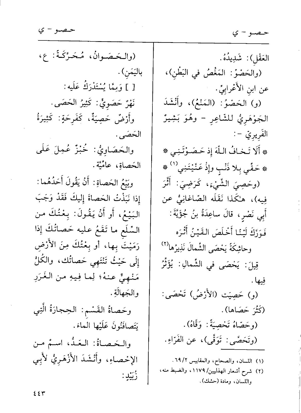(و) } الحَصْوُ: (المَنْعُ) ، وأنْشَدَ الجَوهريُّ للشاعِرِ، وَهُوَ بَشِيرٌ الفَريريُّ: