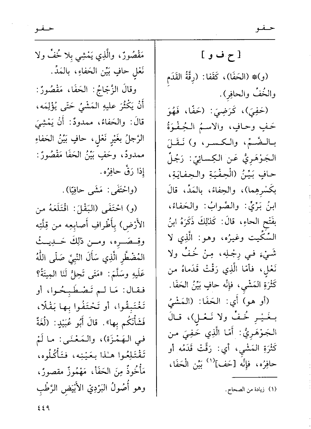 قالَ ابنُ برِّي: والصَّوابُ} والحَفَاء، بفتْحِ الحاءِ، قالَ: كذلِكَ ذَكَرَه ابنُ السِّكِّيت وغيرُهُ، وَهُوَ الَّذِي لَا شَيْء فِي رِجْلِه من خُفَ وَلَا نَعْلٍ، فأمَّا الَّذِي رقَّتْ قَدَماهُ من كَثْرةِ المَشْي فإنَّه حافٍ بَيِّنُ {الحَفَا؛