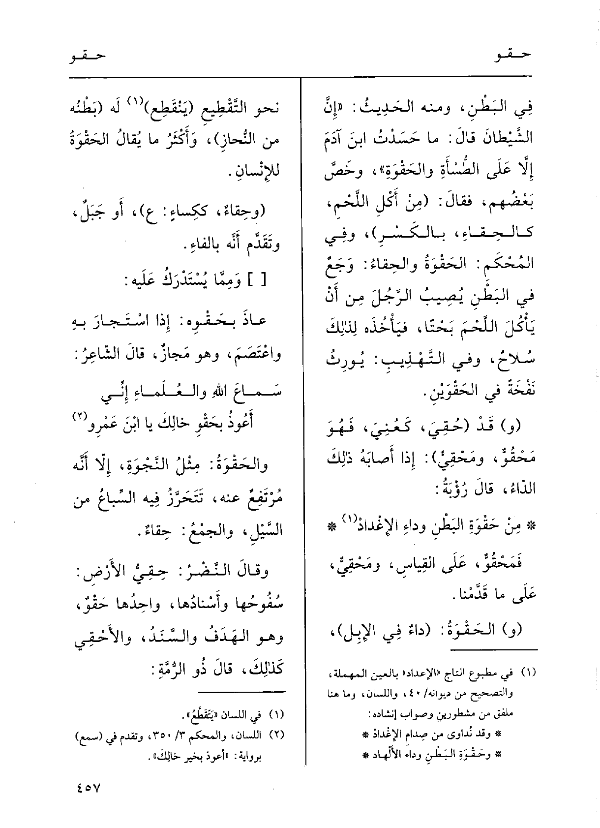 وَفِي المُحْكَم: الحَقْوةُ {والحِقاءُ: وَجَعٌ فِي البَطْنِ يصيبُ الرَّجُل مِن أنْ يأْكُلَ اللَّحْمَ بَحْتاً فيأْخُذَه لذلِكَ سُلاحٌ وَفِي التهْذِيِ: يورِثُ نَفْخَةً فِي} الحَقْوَيْن.