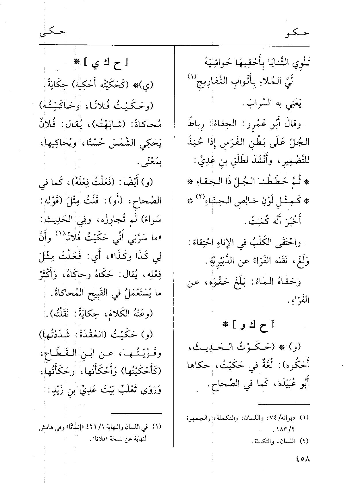 يقالُ: {حَكَاهُ} وحاكَاهُ، وأَكْثَر مَا يُسْتَعْمل فِي القبيحِ {المُحاكاةُ.