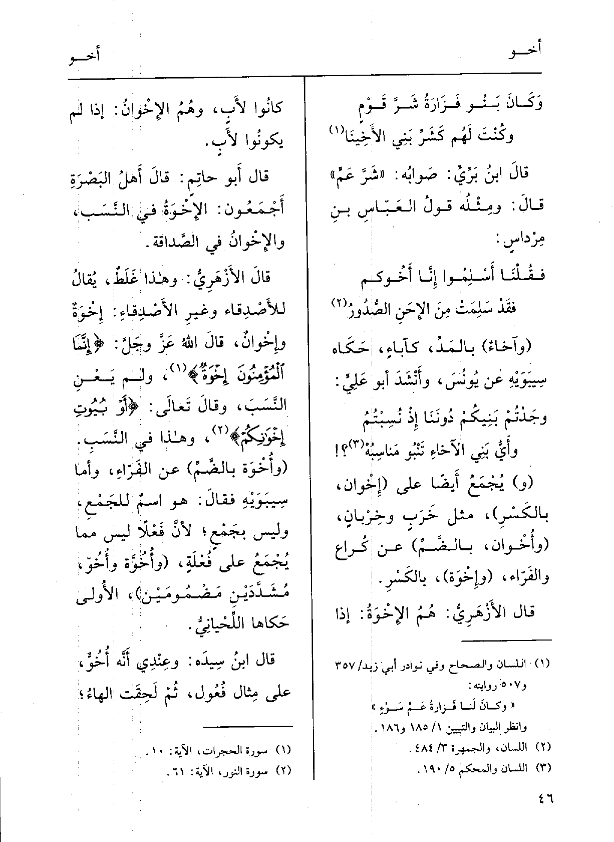 قالَ أَبو حاتِم: قالَ أَهْلُ البَصْرَةِ أَجْمَعونَ: الإخْوةُ فِي النَّسَبِ،} والإِخْوان فِي الصَّداقَةِ.