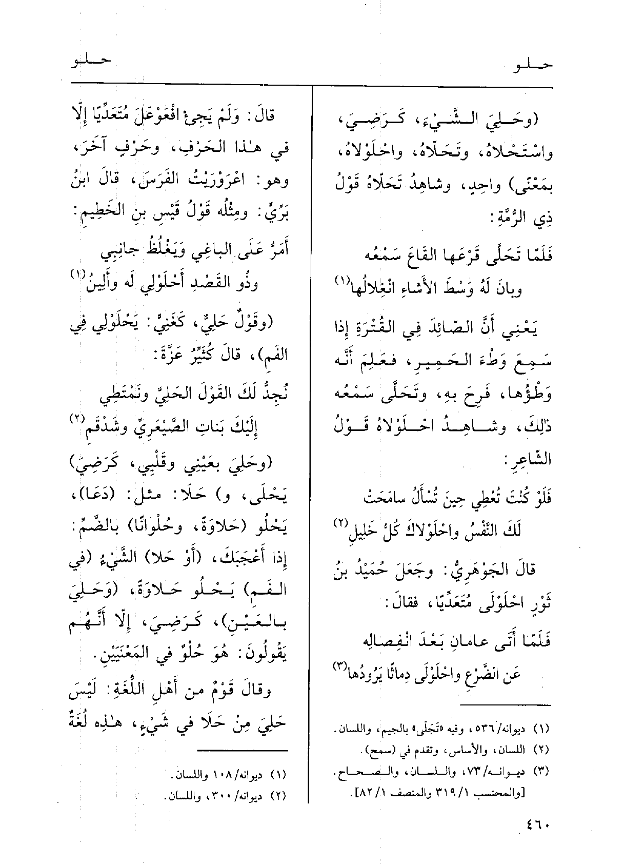 ( {وحَلِيَ الشَّيءَ، كرَضِيَ،} واسْتَحْلاهُ {وتَحَلاَّهُ} واحْلَولاهُ بِمَعْنًى) واحِدٍ؛ شاهِدٌ تَحَلاَّهُ قوْلُ ذِي الرُّمَّة: