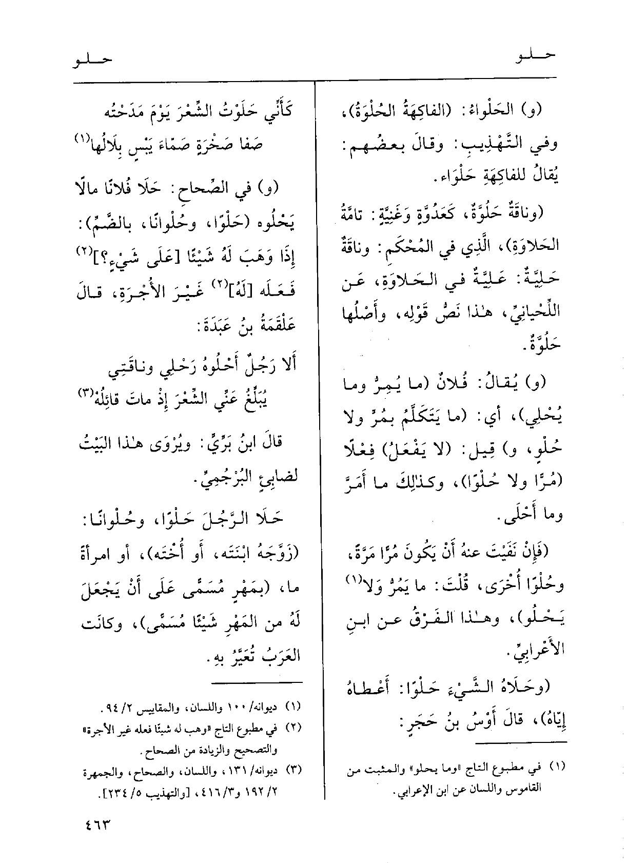 صَفا صَخْرَةٍ صَمَّاءَ يَبْسٍ بِلالُها (و) فِي الصِّحاحِ: حَلا فلَانا مَالا يَحْلُوه (حَلْواً {وحُلواناً، بالضَّمِّ) : إِذا وَهَبَ لَهُ شَيْئا فعله غَيْر الأُجْرَة؛ قالَ عَلْقَمة ابنُ عَبَدَة: