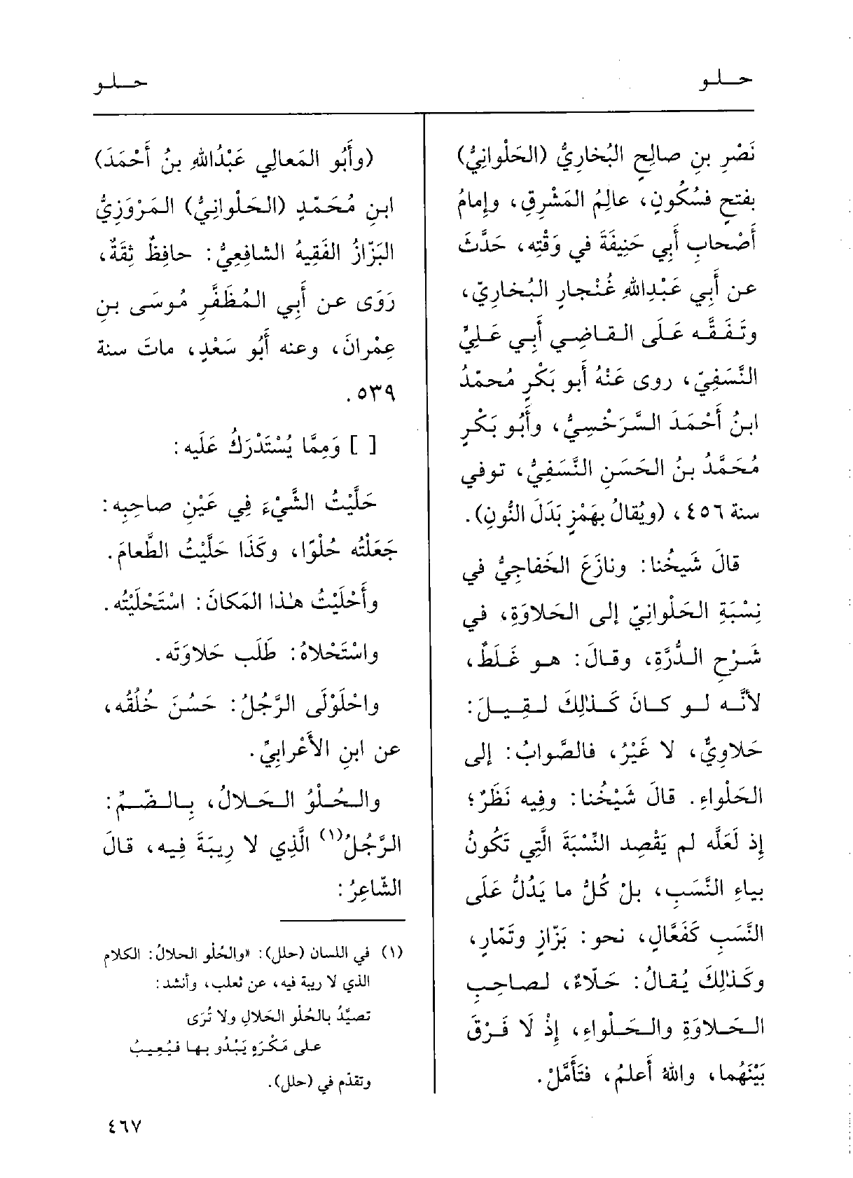 نَصْرِ بنِ صالِحٍ البُخارِيُّ ( {الحَلْوانِيُّ) ، بفتْحٍ فسكونٍ؛ عالِمُ المَشْرق وإمامُ أَصْحابِ أَبي حنيفَةَ وَفِي وَقْتِه، حدَّثَ عَن أَبي عبدِ الله غُنْجار البُخارِي، وتَفَقَّه على القاضِي أَبي عليَ النسفيّ، رَوَى عَنهُ أَبُو بكْرٍ محمدُ بنُ أحمدَ السرخسيُّ، وأَبو بكْرٍ محمدُ بنُ الحَسَنِ النسفيُّ، توفّي سَنَة 456؛ (ويقالُ بهَمْزٍ بدلَ النونِ.