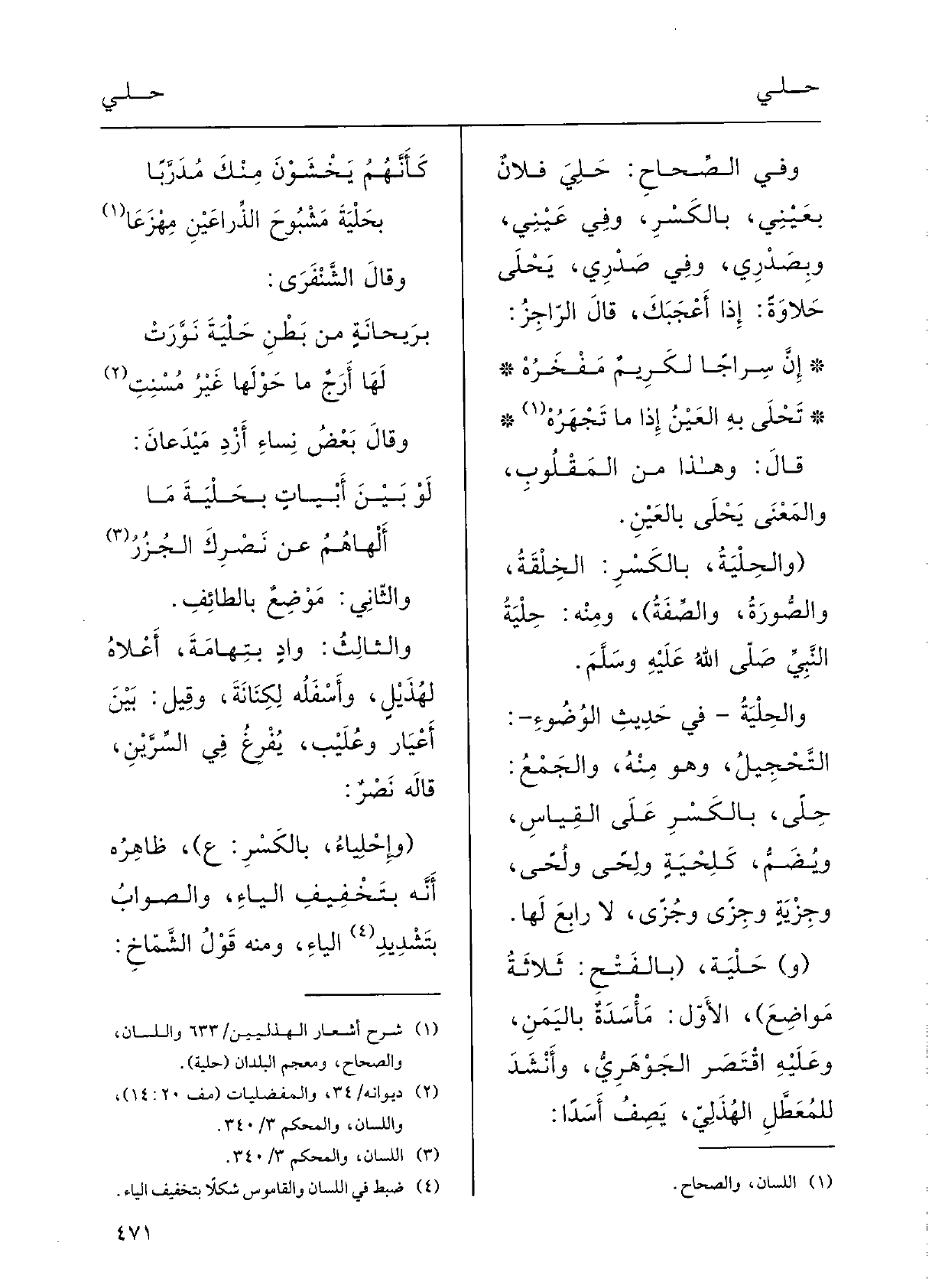 (والحِلْيَةُ فِي حِديثِ الوُضوءِ: التَّحْجِيل، وَهُوَ مِنْهُ، والجَمْعُ حِلىً، بالكَسْرٍ على القِياسِ ويُضَمُّ، كلِحْيَةٍ ولِحىً ولُحىً، وجِزْيَةٍ وجِزىً وجُزىً لَا رابِعَ لَهَا.