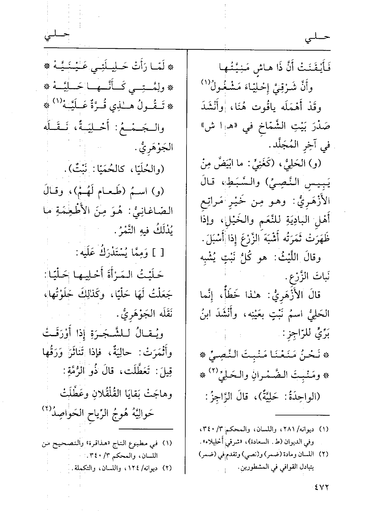 قالَ الأزْهريُّ: هَذَا خَطَأٌ إنَّما الحَلِيُّ اسْم نُبْتٍ بعَيْنِه، وأَنْشَدَ ابنُ برِّي للراجزِ:
