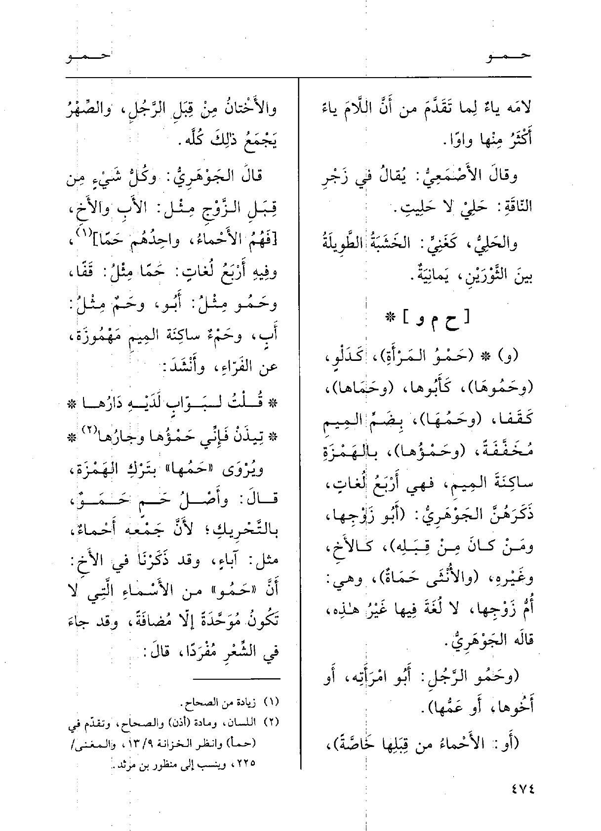 قالَ الجوهرِيُّ: وكلُّ شيءٍ من قِبَلِ الزَّوْجِ مثْلُ الأبِ والأخِ فهم الأحماء وَاحِدهَا} حَمّا فَفِيهِ أَرْبَع لُغاتٍ حَماً مثْلُ قَفاً، وحَمُو مثْل أَبُو، {وحَمٌ مثْل أَبٍ، وحَمْءٌ ساكِنَةَ المِيمِ مَهْموزَةِ، عَن الفرَّاءِ، وأَنْشَدَ: