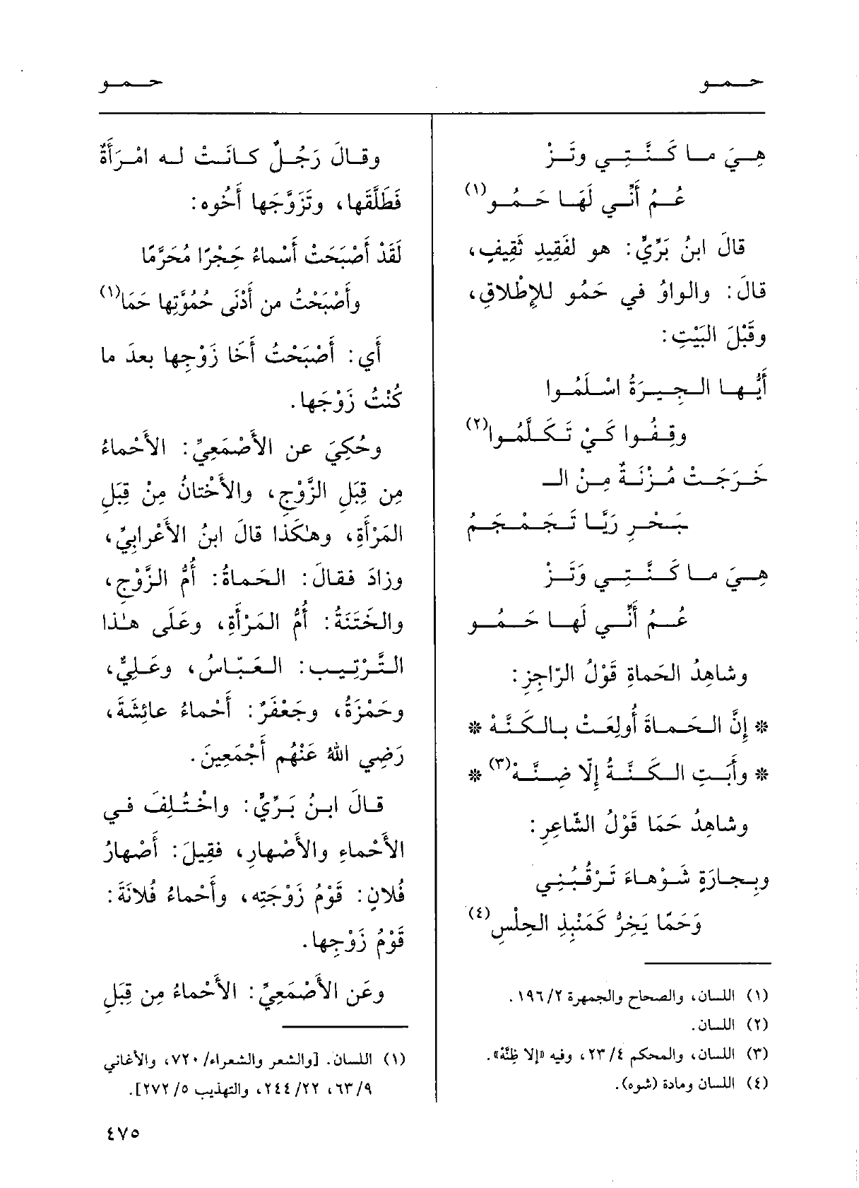 وحكِي عَن الأصمعيّ: الأَحْماءُ من قِبَلِ الزَّوْجِ، والأَخْتانُ من قِبَل المرْأَةِ؛ وَهَكَذَا قالَهُ ابنُ الأعرابيّ وزادَ فقالَ: الحَماةُ أُمُّ الزَّوْجِ، والخَتَنةُ أمُّ المرأَةِ، وعَلى هَذَا التَّرْتيبِ العباسُ وعليُّ وحمزةُ وجَعْفر} أَحْماءُ عائِشَةَ، رضِيَ اللَّهُ عَنْهُم أَجْمَعِين.