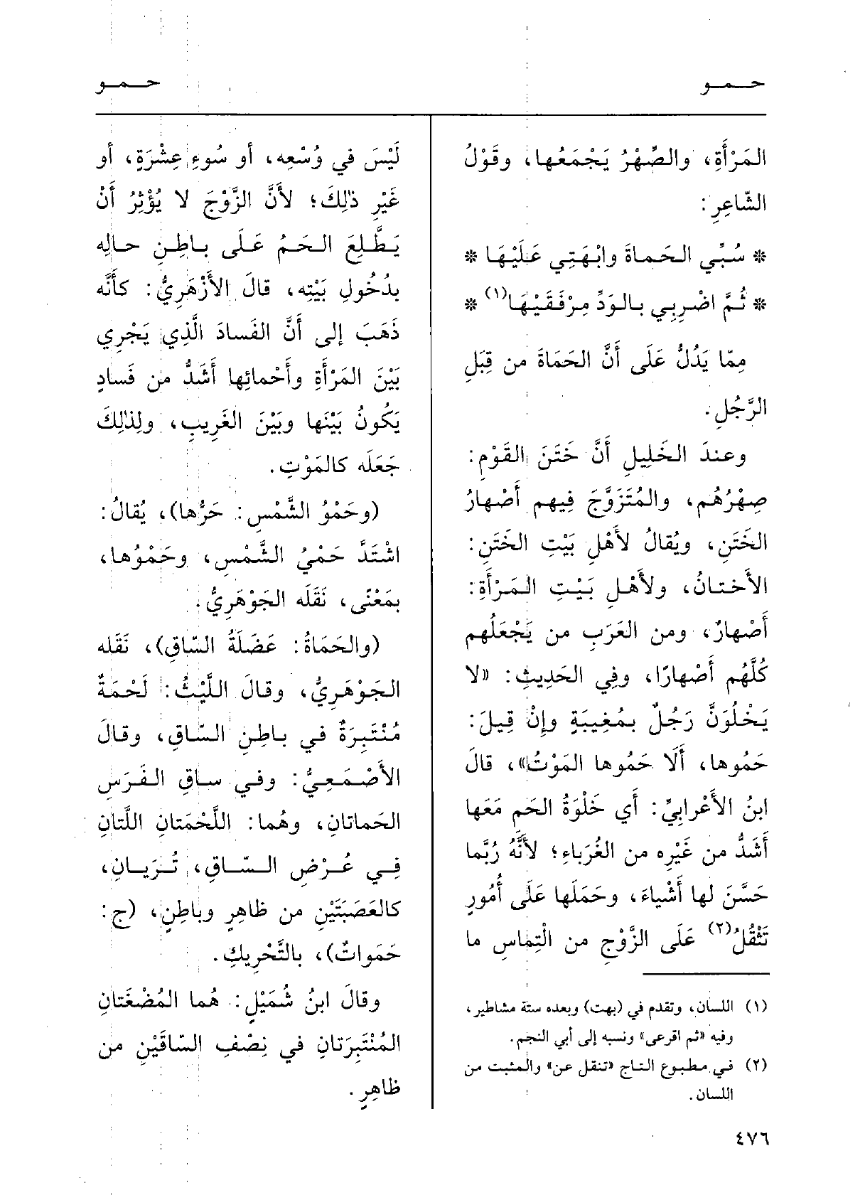 وَقَالَ الأَصمعيُّ: وَفِي ساقِ الفَرَسِ {الحَماتانِ، وهُما اللَّحْمتانِ اللَّتانِ فِي عُرْض السَّاقِ تُرَيانِ كالعَصَبَتَيْنِ مِن ظاِهرٍ وباطِنٍ؛ (ج} حَمَوَاتٌ) ، بالتَّحرِيكِ.