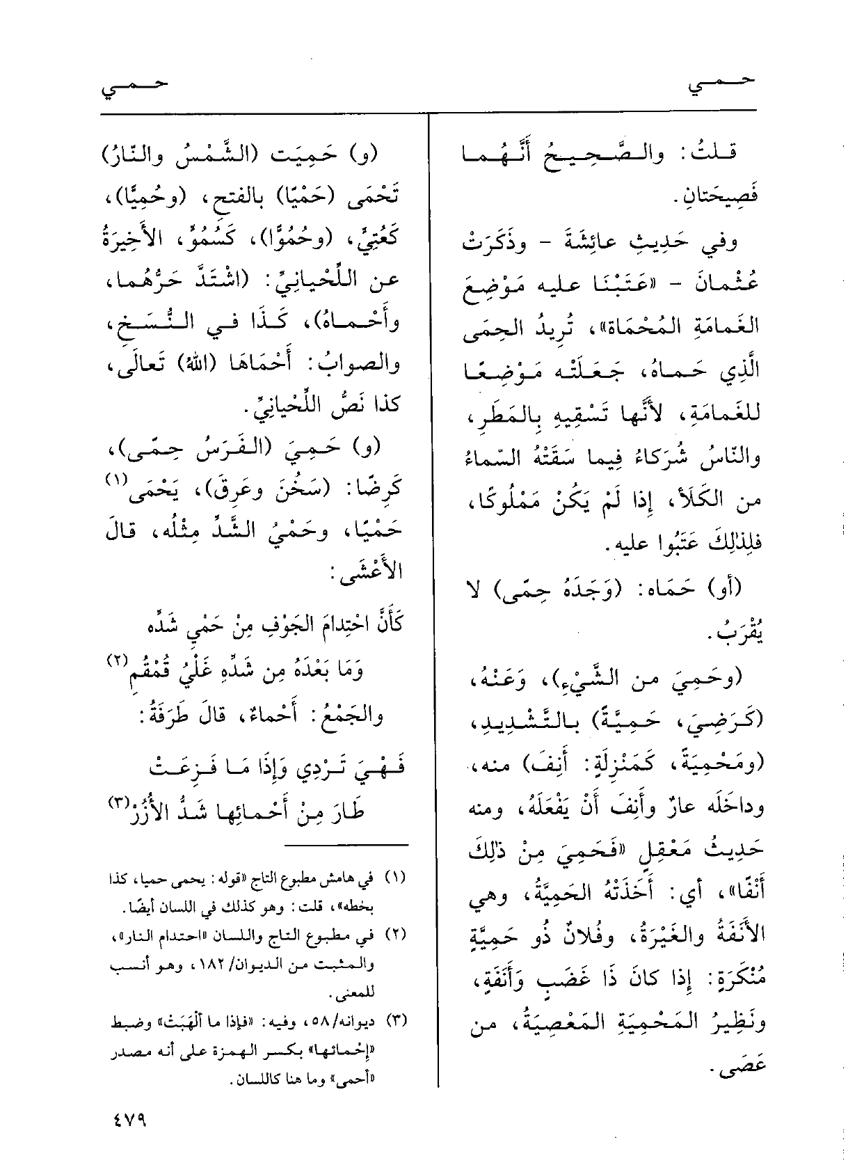 (و) } حَمِيَتِ (الشَّمسُ والنَّارُ) تَحْمَى ( {حَمْياً) ، بالفتْحِ، (} وحُمِيّاً) ، كعُتَيَ، ( {وحُمُوّاً) ، الأَخيرَةُ عَن اللَّحْيانيّ: (اشْتَدَّ حَرُّهما،} وأحْماهُ) ، كَذَا فِي النُّسخِ والصَّوابُ {أَحْماها، (اللَّهُ) تَعَالَى؛ كَذَا نصُّ اللَّحْيانيّ.
