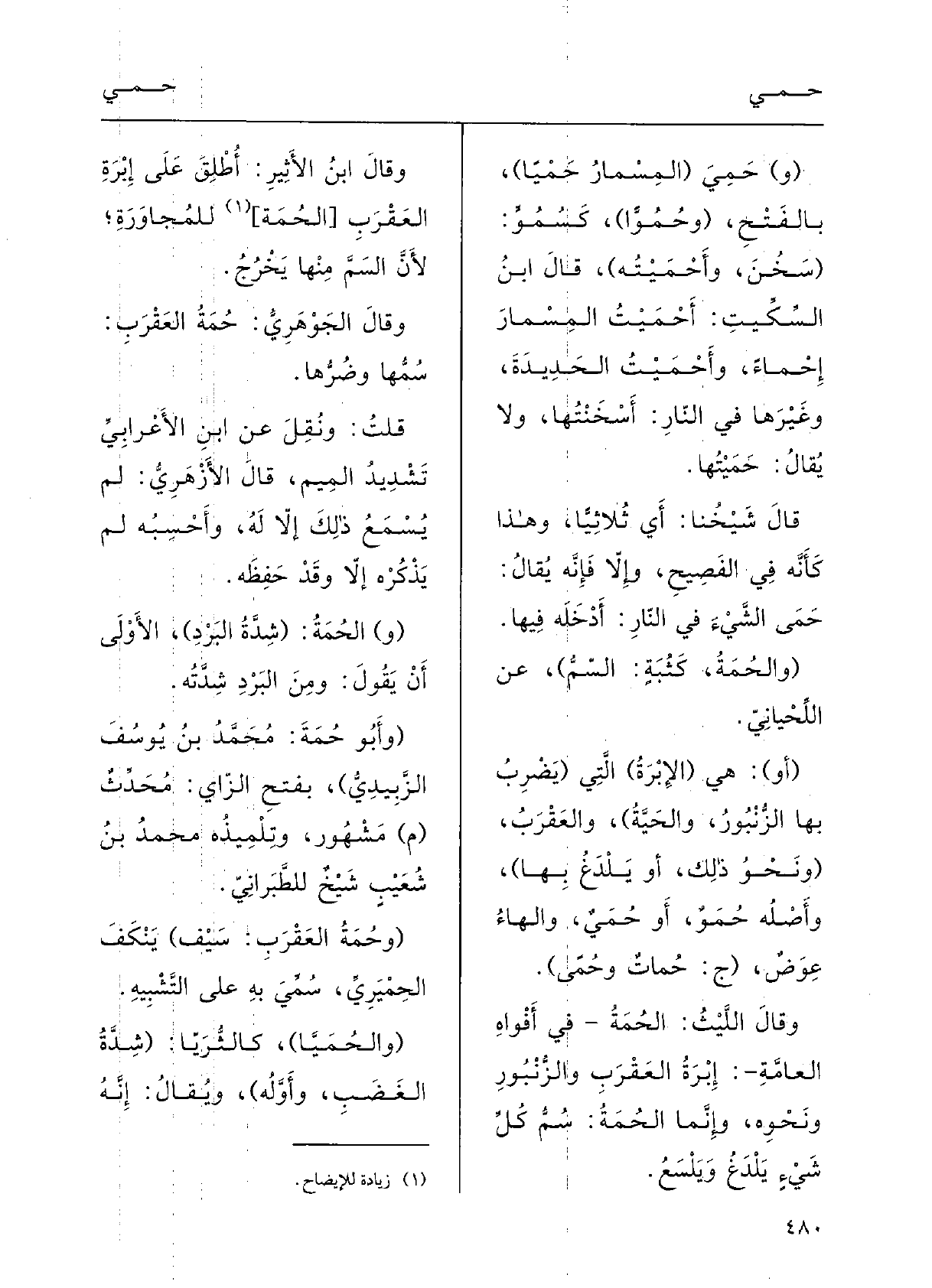 (وقالَ الليْثُ: {الحُمَةُ فِي أَفْواهِ العامَّةِ: إبْرَةُ العَقْربِ والزُّنْبورِ ونحوِه، وإنَّما الحُمَةُ سَمُّ كلِّ شيءِ يَلْدَغُ ويَلْسَعُ.
