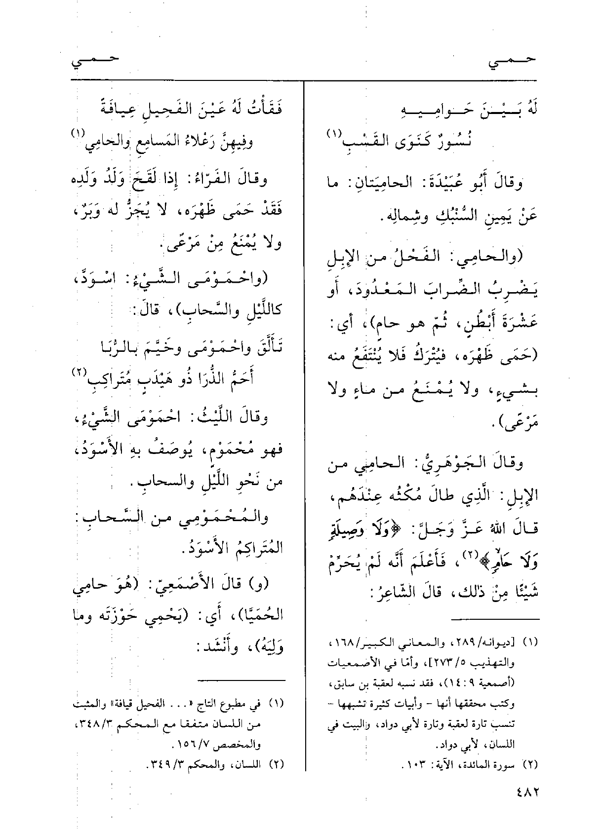 (وَقَالَ الجَوهرِيُّ: {الحامِي مِن الإِبِلِ الَّذِي طالَ مَكْثَه عنْدَهُم؛ قالَ اللَّهُ عزَّ وجلَّ: {وَلَا وَصِيلةٍ وَلَا حامٍ} ؛ فأَعْلَم أنَّه لم يُحَرِّمْ شَيْئا من ذلِكَ؛ قالَ الشاعِرُ: