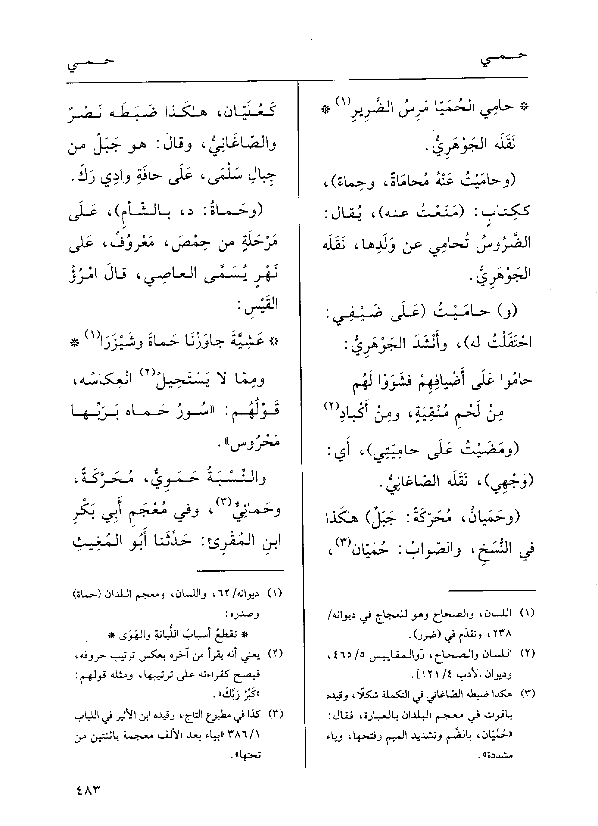 عَشِيَّةَ جَاوَزْنا {حَمَاةَ وشَيْزَرا وممَّا لَا يَسْتحيل انْعِكاسه قَوْلَهم سور} حَمَاه بربِّها مَحْروس، والنِّسْبَةُ! حَمَوِيٌّ، محرّكةً، وحمائيٌّ.
