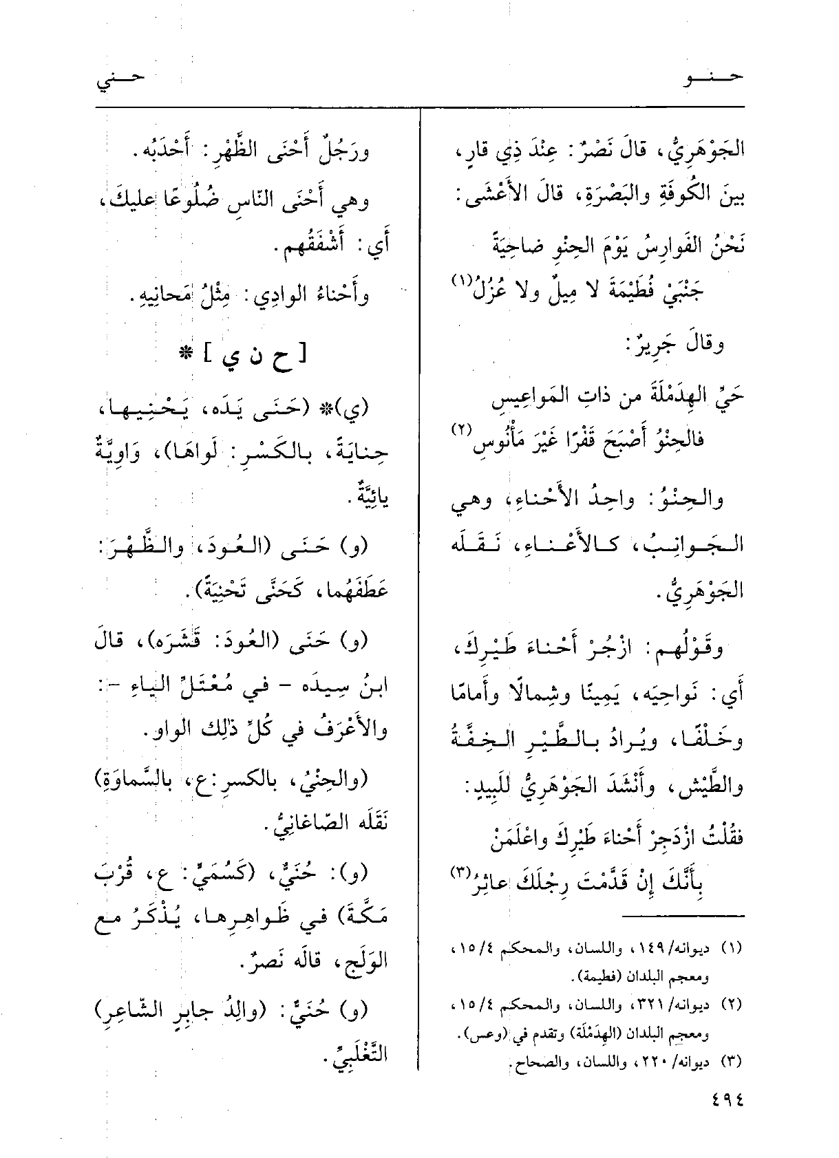 : (ي (} حَنَى يَدَهُ يَحْنِيها {حِنايَةً، بالكسْرِ: لَوَاها) ؛) واوِيَّةٌ يائِيَّةٌ.