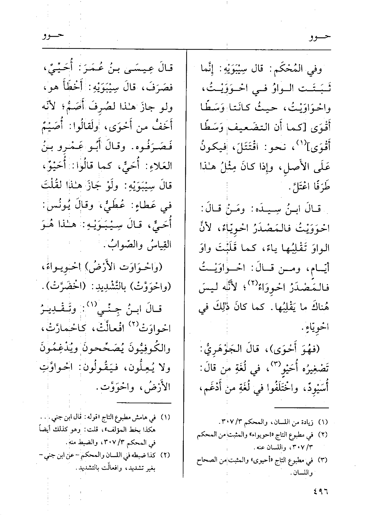 (قالَ ابنُ جنيِّ: وتَقْديرُ} احْواوَّتْ افْعَالَّتْ كاحْمَارَّتْ. والكُوفيّونَ يُصَحِّحونَ ويُدْغِمُون وَلَا يُعِلُّون فيقولونَ! احْوَاوَّتِ الأرضُ واحْوَوَّتْ.
