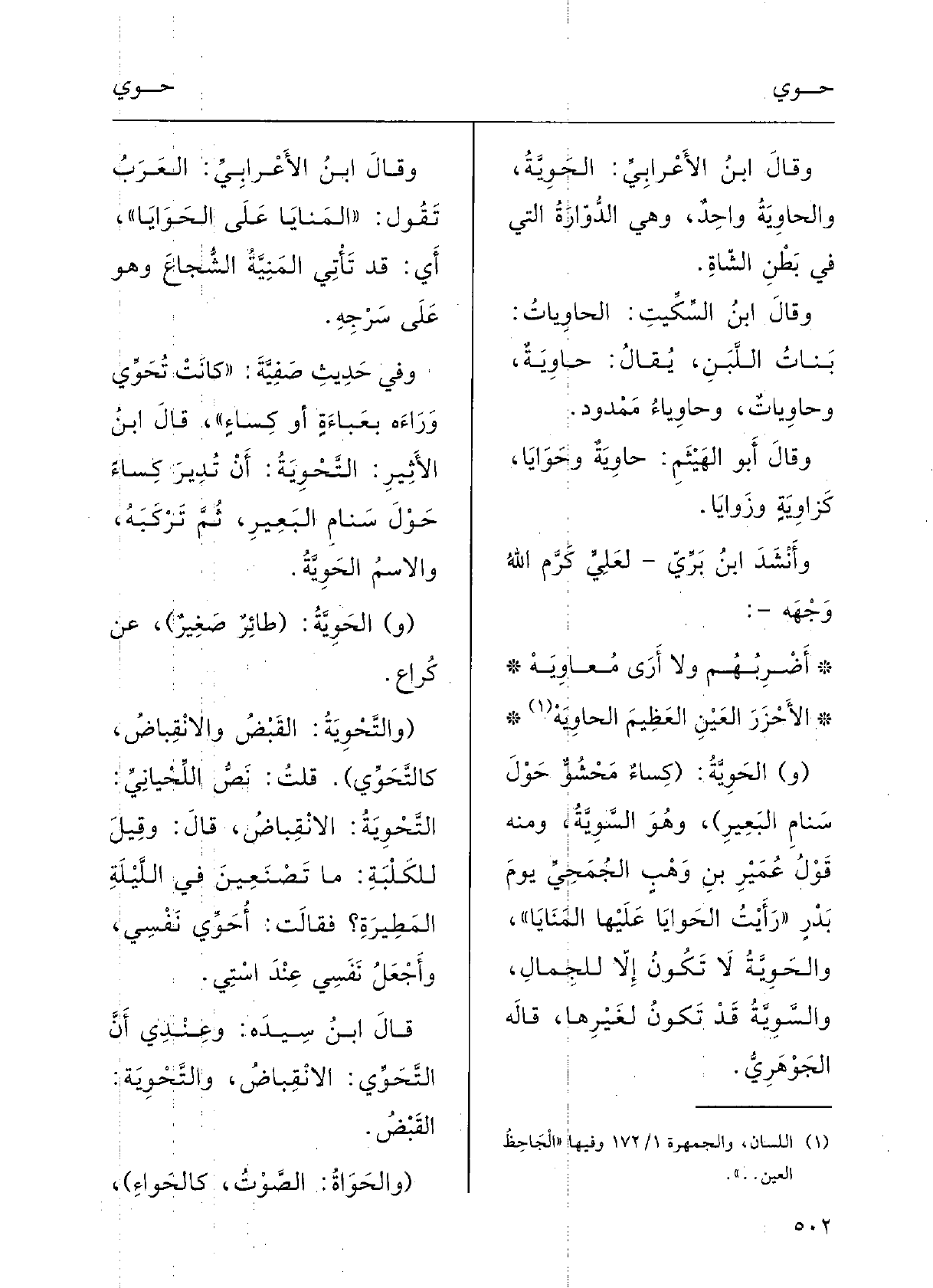 وَقَالَ أَبو الهَيْثم: حاوِيَةٌ {وحَوَايا كزَاوِيَة وزَوَايا؛ وأَنْشَدَ ابنُ برِّي لعليَ، كرَّمَ اللَّهُ وجْهَه: