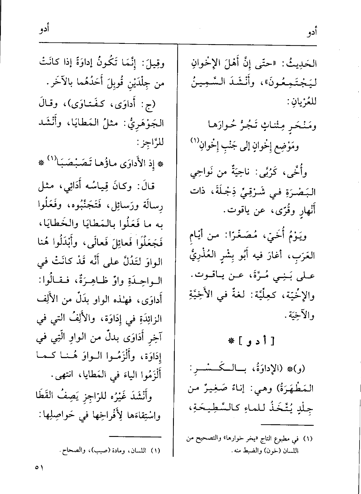 إِذْ {الأداوَى مَاؤُها تَصَبْصَبا قالَ: وكانَ قِياسُه} أَدائِيَ مثْلَ رِسالَةٍ ورَسائِل، فتَجَنَّبُوه وفَعَلوا بِهِ مَا فَعَلوا بالمَطايَا والخَطاَيا، فجَعَلُوا فَعائِلَ فَعالَى، وأَبْدلُوا هُنَا الواوَ لتدلَّ على أنَّه قد كانتْ فِي الواحِدَةِ واوٌ ظاهرَةٌ فَقَالُوا أَداوَى، فَهَذِهِ الْوَاو بدلٌ مِن الألِفِ الزائِدَةِ فِي إداوَةٍ، والألِفُ الَّتِي فِي آخر أَداوَى بدلٌ مِن الواوِ الَّتِي فِي إداوَةٍ، وأَلْزمُوا الْوَاو هُنَا كَمَا أَلْزمُوا الياءَ فِي المَطايا، انتَهَى.